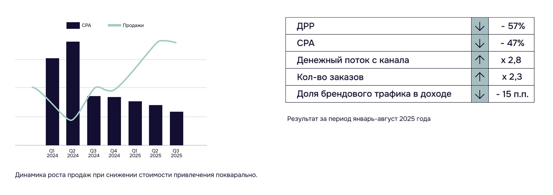 — Доля рекламных расходов (ДРР) снизилась до плановых отметок, сделав маркетинг прибыльным.