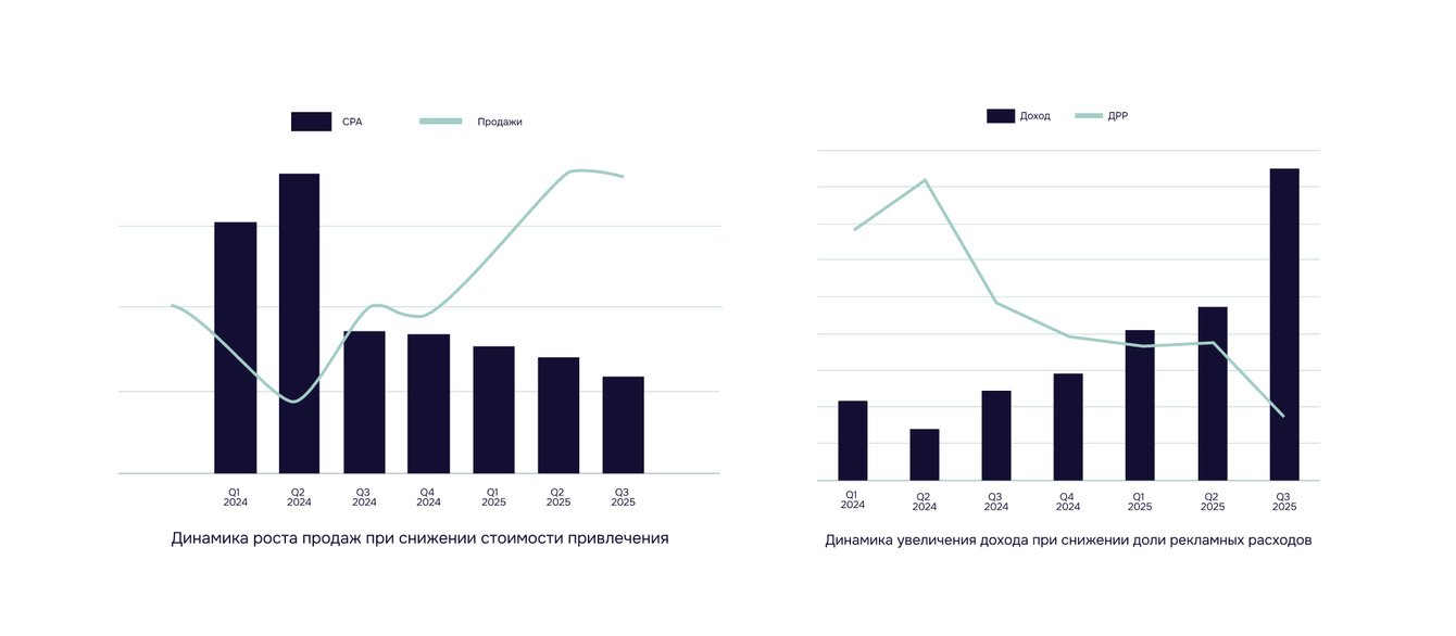 Работа с Damixa строилась именно на этом принципе. Мы провели ребалансировку рекламного портфеля: отказались от низкодоходных инструментов, перераспределили капитал в высокоэффективные категории и ввели постоянный контроль за «доходностью активов» — показателями CPA, ДРР и конверсии.