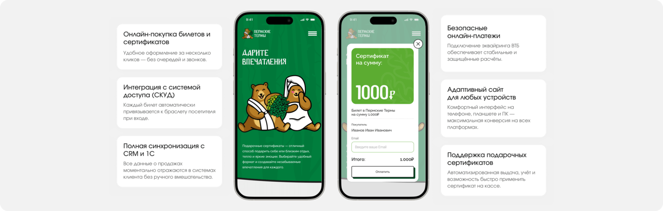 Наша система реализует отдельный процесс продажи онлайн-билетов и подарочных сертификатов для Термального комплекса в городе Пермь. Благодаря ей заказчик получил новый эффективный канал сбыта, что позволило существенно повысить конверсию продаж.