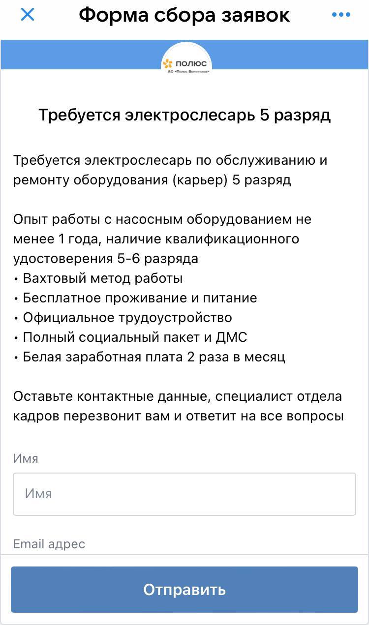 Для каждой профессии мы разработали свои объявления и лид-формы. Лид-форма представляет из себя небольшую посадочную страницу с текстом и данными для заполнения (например: имя, номер телефона, email и др.). В ней мы ещё раз расписали все преимущества вакансии, чтобы человек переходя по объявлению мог закрыть все вопросы для себя. Ответы на форму можно получать по email, в CRM и личные сообщения ВК.
