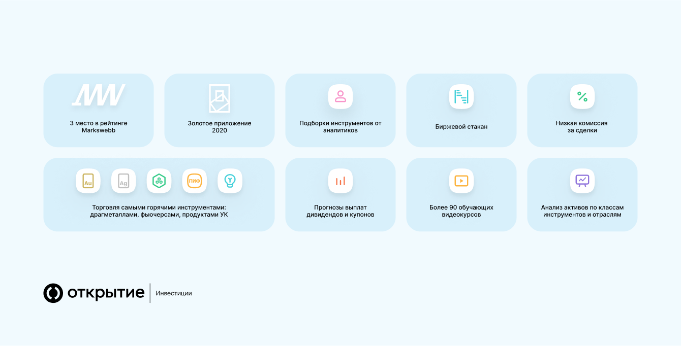 В приложении «Открытие Инвестиции» доступны любые инвестиционные продукты на российском рынке: валюта, акции, облигации и фонды, все бумаги российских компаний, драгоценные металлы и даже фьючерсы.
