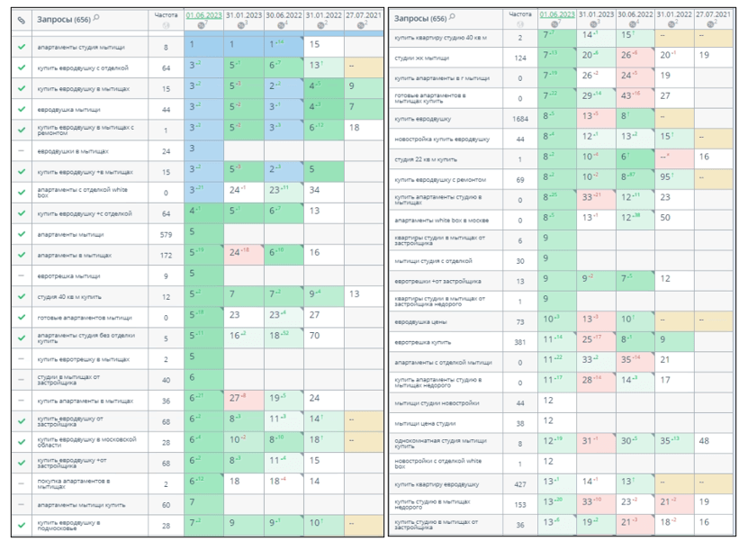 Результаты по позициям получились следующие, данные предоставлены за разные временные рамки работ, поскольку семантическое ядро расширялось: