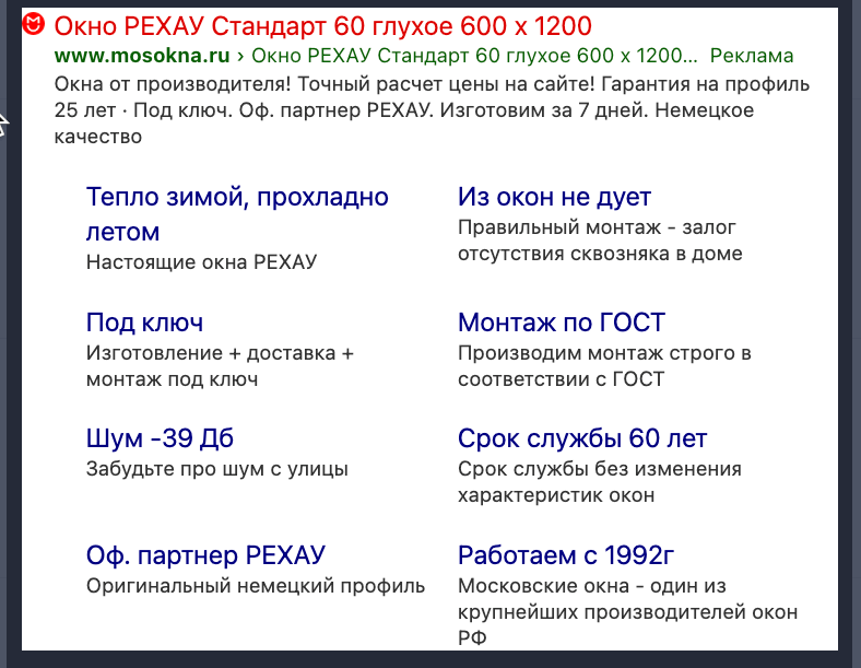 На поиске запущены стандартные кампании по семантике: брендовая кампания, Рехау, кампания с семантикой по балконам и окнам, баннер на поиске, кампания по конкурентам. Вот примеры брендовой РК на поиске и баннера на поиске.