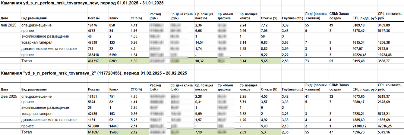 Важно! Так как кампания была только запущена по новому фиду, ей необходимо время на обучение, поэтому целевые метрики по лидам и контактам пока некорректно сравнивать с обученной кампаний по старому фиду. Тем не менее, в марте 2025 мы уже наблюдаем прирост лидов и снижение CPL.