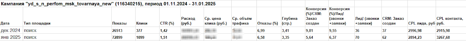 Нам удалось обучить МК преимущественно на поиск. Гипотеза сработала — благодаря запуску товарной кампании на МК нам удалось снизить CPL. В январе товарная кампания показала результаты еще лучше, чем в декабре: CTR составил 1,51 %, CPL лида — 2894 руб, CPL контакта — 3267 руб.