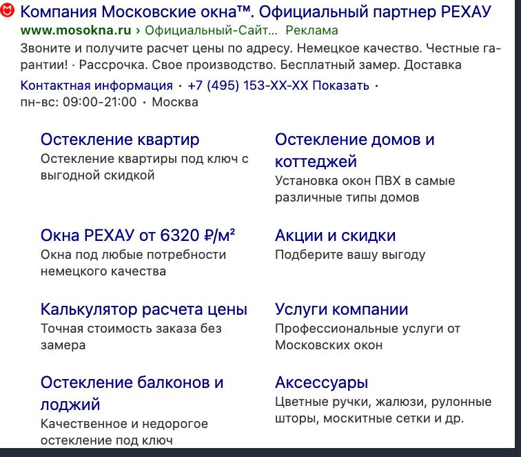 - На поиске запущены стандартные кампании по семантике: брендовая кампания, Рехау, кампания с семантикой по балконам и окнам, баннер на поиске, кампания по конкурентам. Вот примеры брендовой РК на поиске и баннера на поиске.