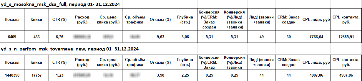 - Мы увидели значительное снижение стоимости клика — потому что трафик в сетях более дешевый. За счет этого мы привели намного больше трафика, это сказалось на показателе CTR и проценте конверсии. При этом сократили CPL лида на 37 %, а контакта - на 61 %. Вот сравнительная статистика двух кампаний в декабре: