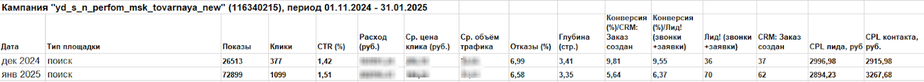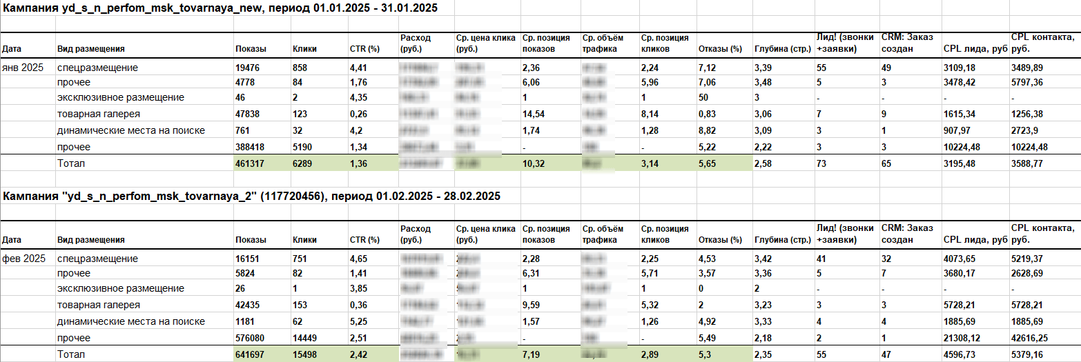 Важно! Так как кампания была только запущена по новому фиду, ей необходимо время на обучение, поэтому целевые метрики по лидам и контактам пока некорректно сравнивать с обученной кампаний по старому фиду. Тем не менее, в марте 2025 мы уже наблюдаем прирост лидов и снижение CPL.