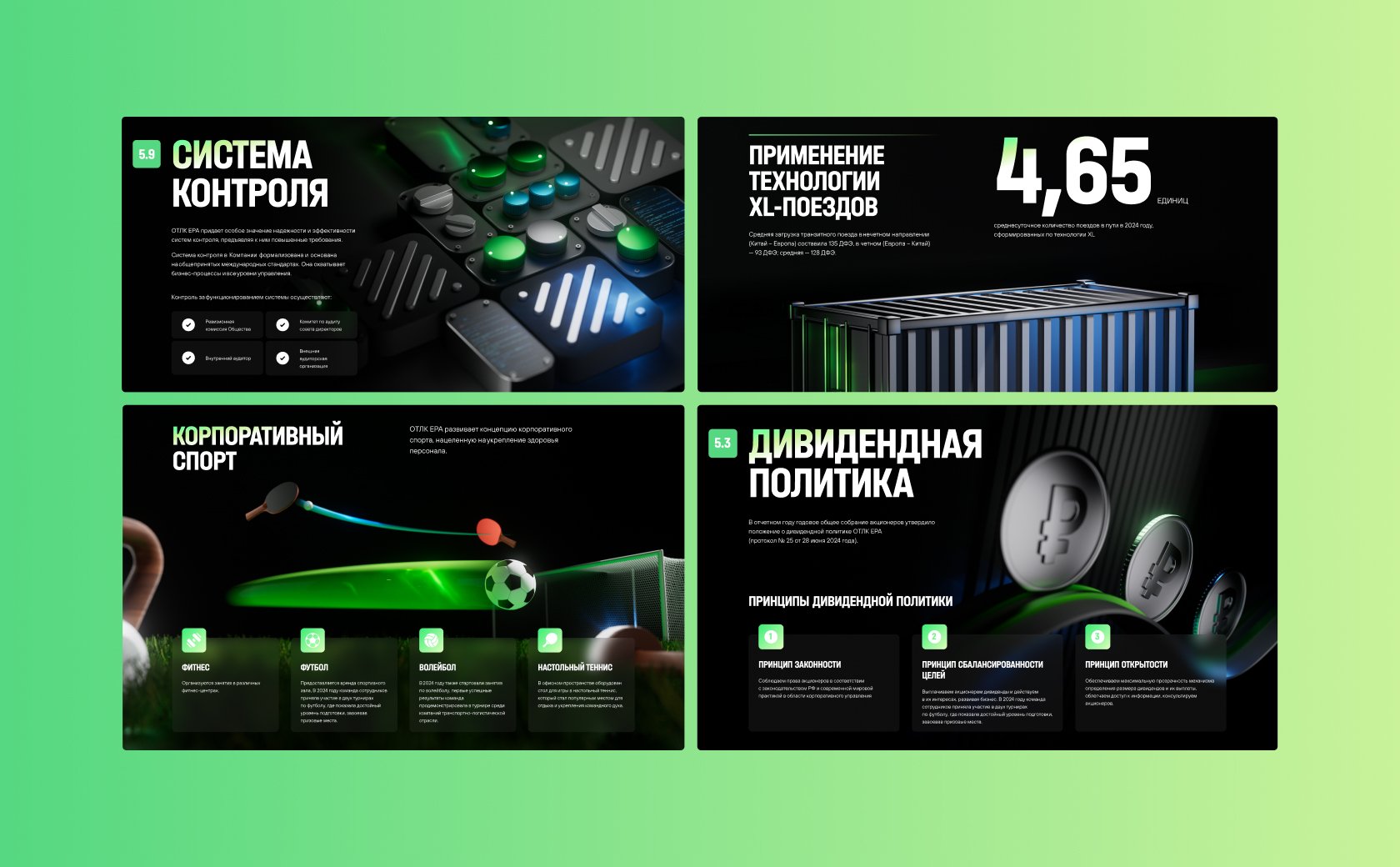 ⁃ В свою очередь, смыслы отражаются через симулятивные линии с эффектом движения, железнодорожные пути, образы контейнеров и грузов, инфографических объектов и схемы корпоративного управления.