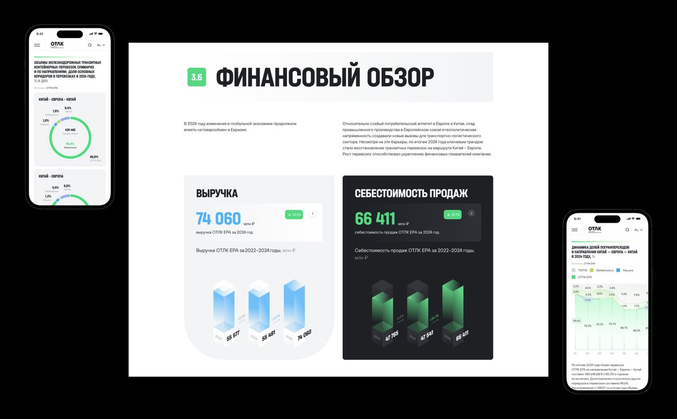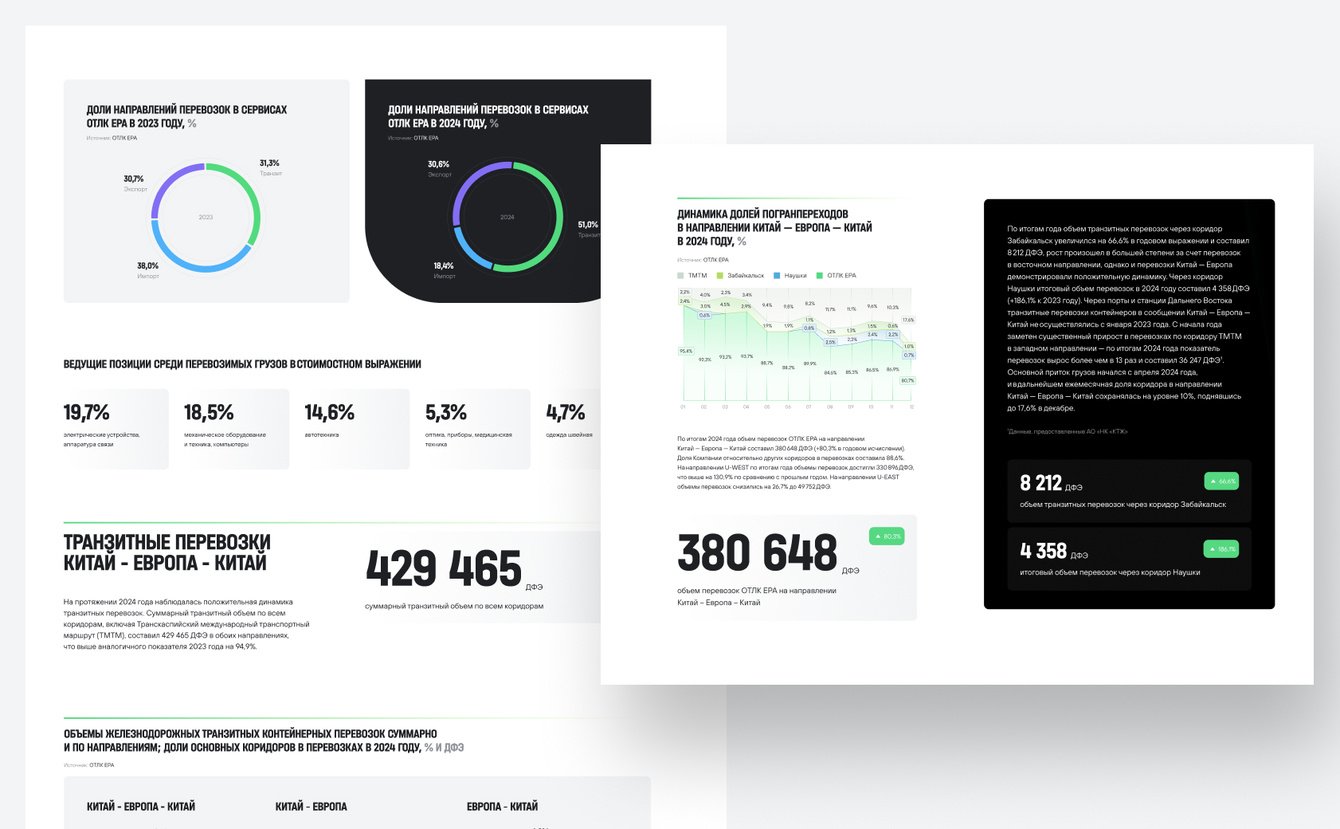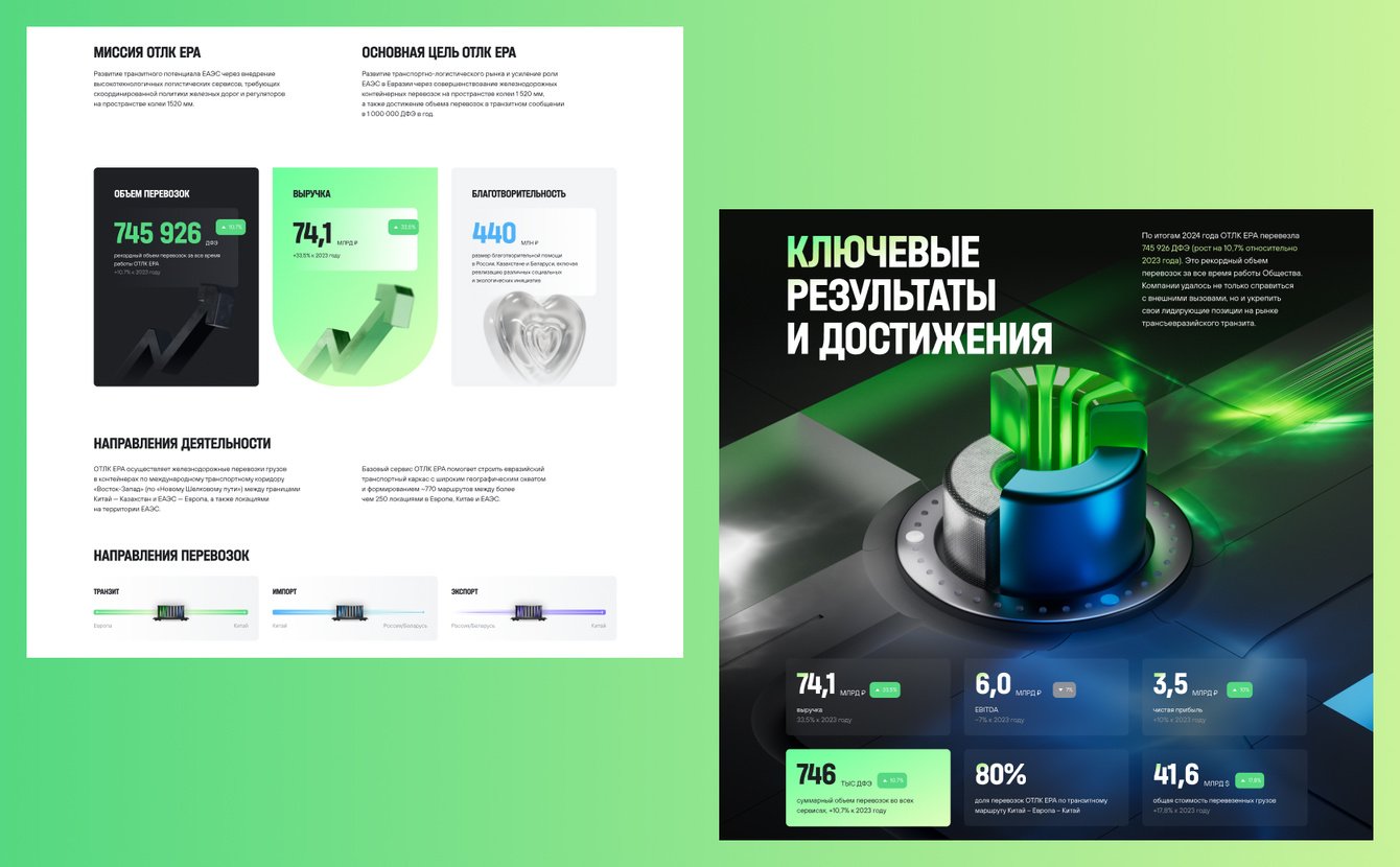 ОТЛК ЕРА — оператор железнодорожных транзитных сервисов между Китаем и Европой. Это крупная компания, входящая в список Fortune 500 — каждый год выпускает годовой отчет по итогам своей деятельности и каждый год стремится выделиться, во-первых, относительно себя пришлых версий, во-вторых, относительно годовых отчетов смежных компаний. Последние годы компания находится на этапе модернизации своих цифровых коммуникационных сервисов и годовой отчет здесь является одним из центральных звеньев одной большой цепи.