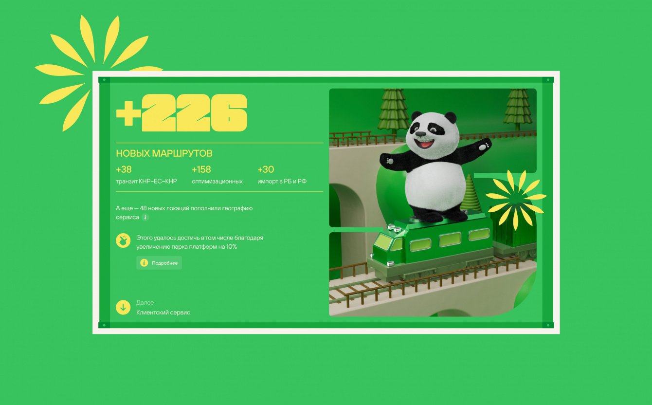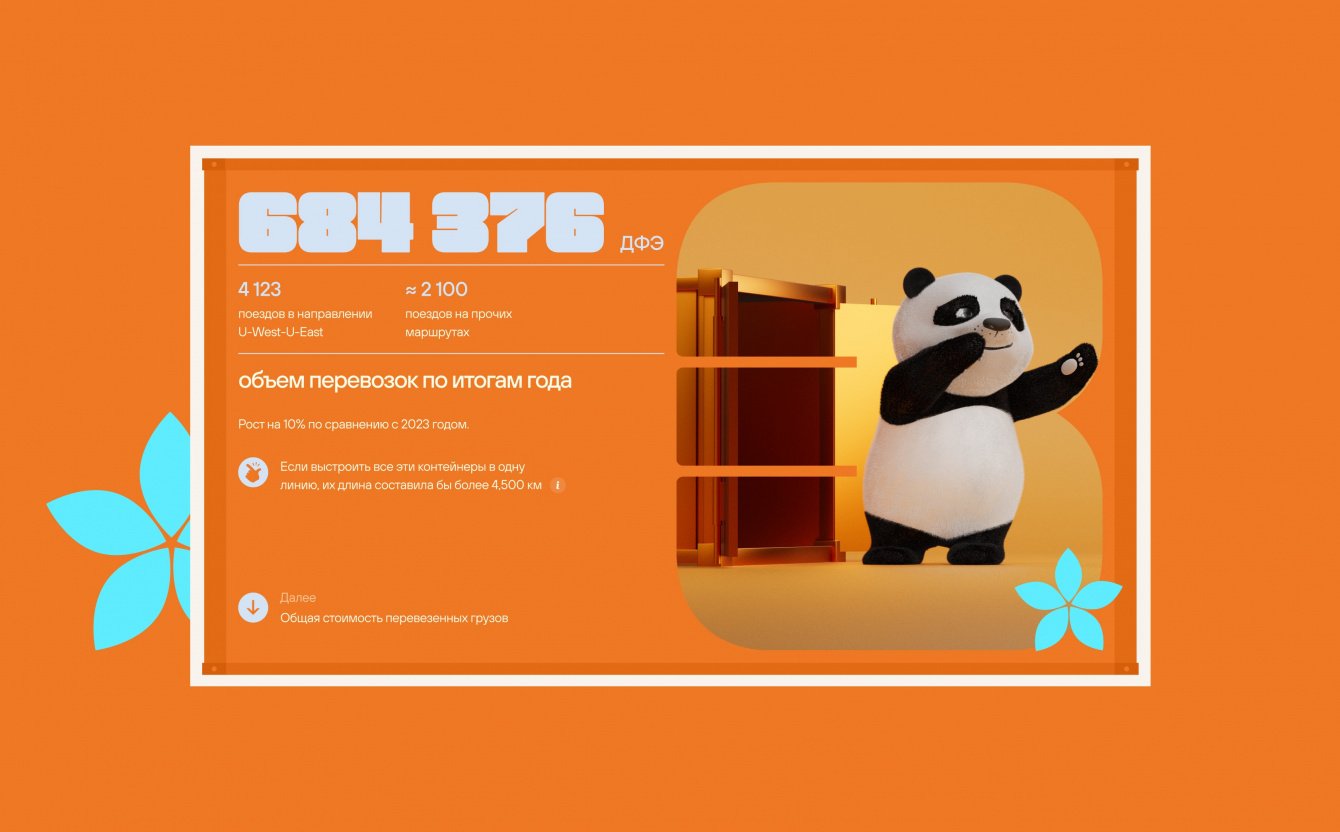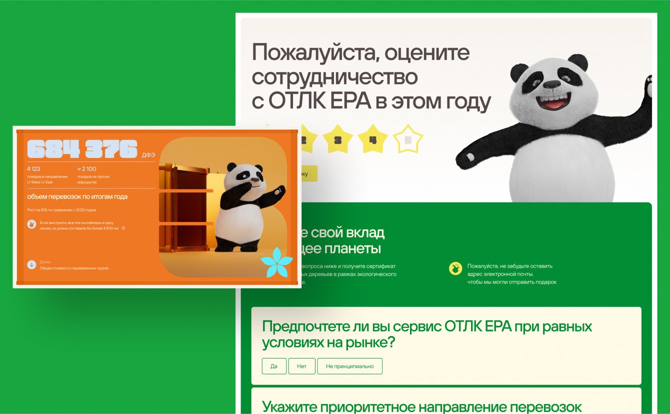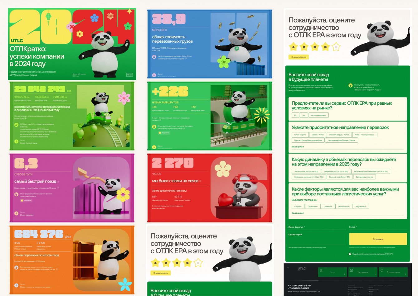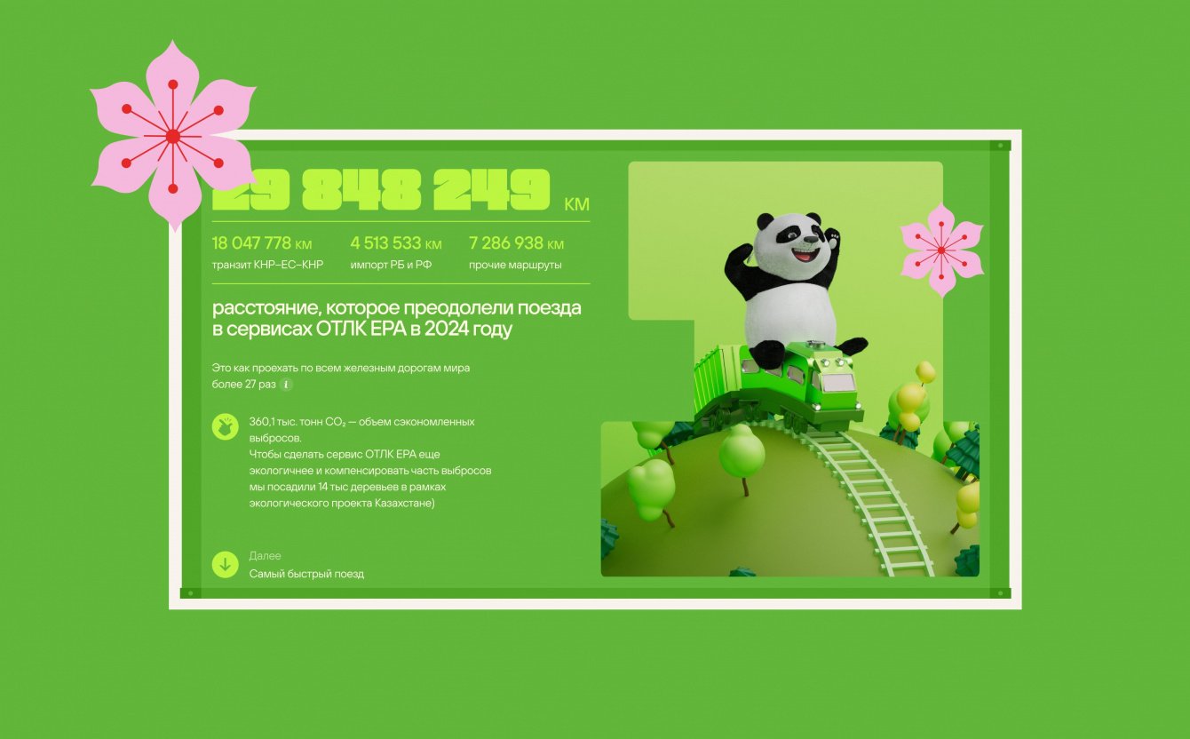 ОТЛК ЕРА ежегодно выпускает итоги уходящего года, в котором показывает статистические данные по основным показателям, связанным с ЖД-логистикой. В 2024 году перед нами была поставлена задача с готовностью к креативу и экспериментам — создать интерактивный, визуально впечатляющий и информативный сайт-отчёт, который не просто представит сухие цифры, но будет содержать визуальную идею и раскрывать показатели через метафоры. Акцент — на ключевые метрики (расстояние, скорость, объём перевозок, новые маршруты), с упором на эмоциональное вовлечение аудитории (клиенты, партнёры и СМИ).
