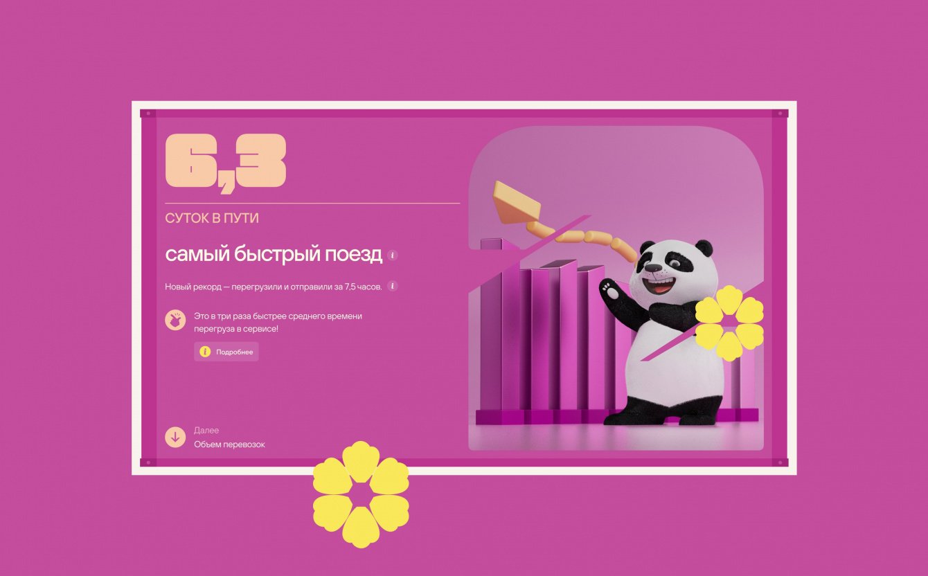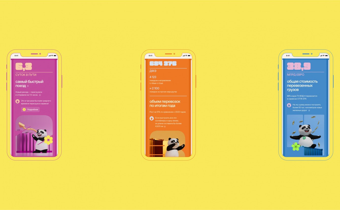 Каждый из показателей визуализирован через анимацию, метафорически передающий смысл для каждого экрана с данными. При этом, для большего понимания пользователя была разработана система сравнений. Так понятнее и интереснее погружаться в статистику. Например, 3 320 236 км — расстояние, которое поезда проехали в этом году. Это как проехать по всем железным дорогам мира более трех раз.