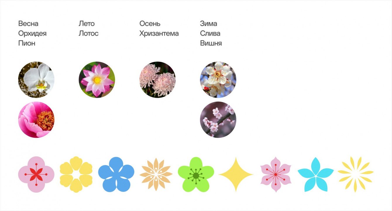 Помимо панды в стилеобразующие образы вошли цветы и цветки, которые символизирую в Китае времена года: орхидея, пион, лотос, хризантема, цветок сливы и вишни. Времена года, образующие календарный год, в рамках которого и накапливаются показатели деятельности компаний.