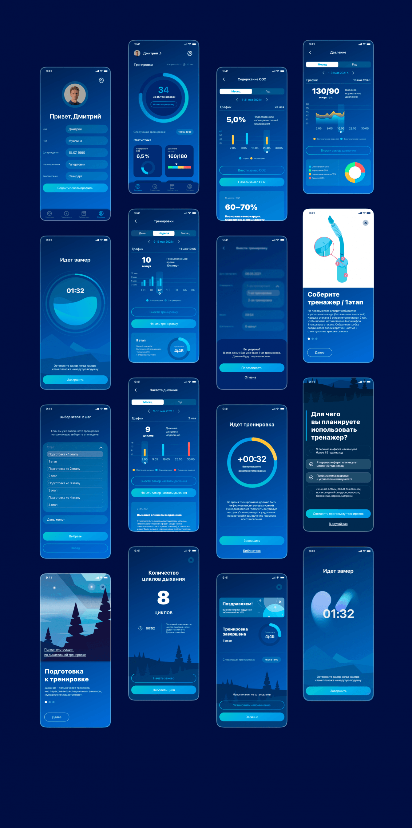 Готовое приложение имеет интуитивно понятную функциональность, а также вовлекающие механики. Сопровождается визуальной концепцией, которая также работает на возвращение пользователя к тренировкам — и к Дыхательному тренажеру.