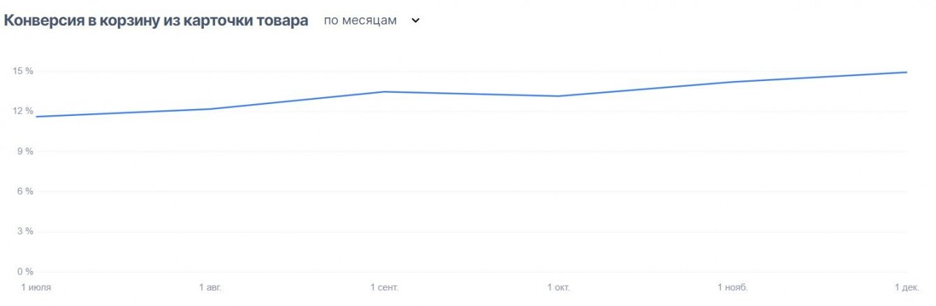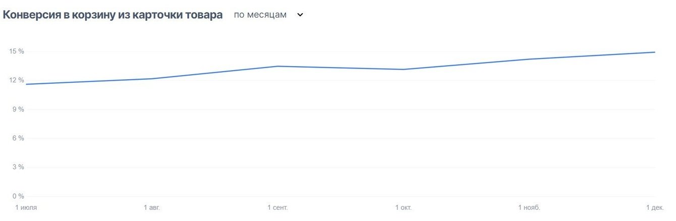 Данные манипуляции позволили увеличить конверсию из карточки товара в корзину с 11% до 15%.