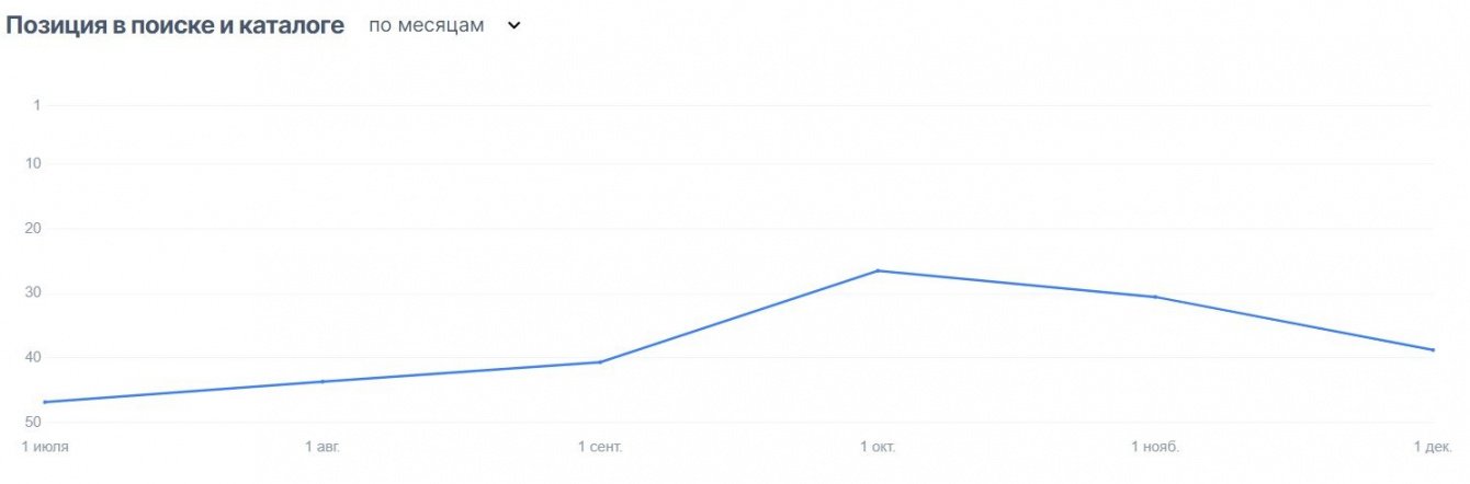 Поднялась средняя позиция товара в поиске и каталоге, с 47 до 39 места. По средней позиции все не так однозначно, бывали месяцы и с более высоким показателем. Контроль остатков происходил на стороне заказчика, и иногда продукция в стоке заканчивалась, что приводило к резкому падению карточек в выдаче.