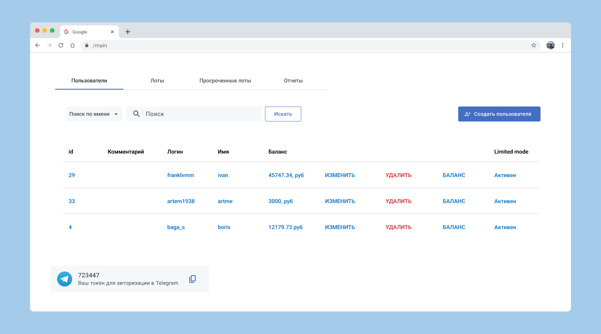 Реализация функционала добавления новых пользователей с различными ролями (Администратор, Сотрудник поддержки, Пользователь). Отображение информации по текущим лотам во всех статусах и изменение статусов после изменения его в системе.