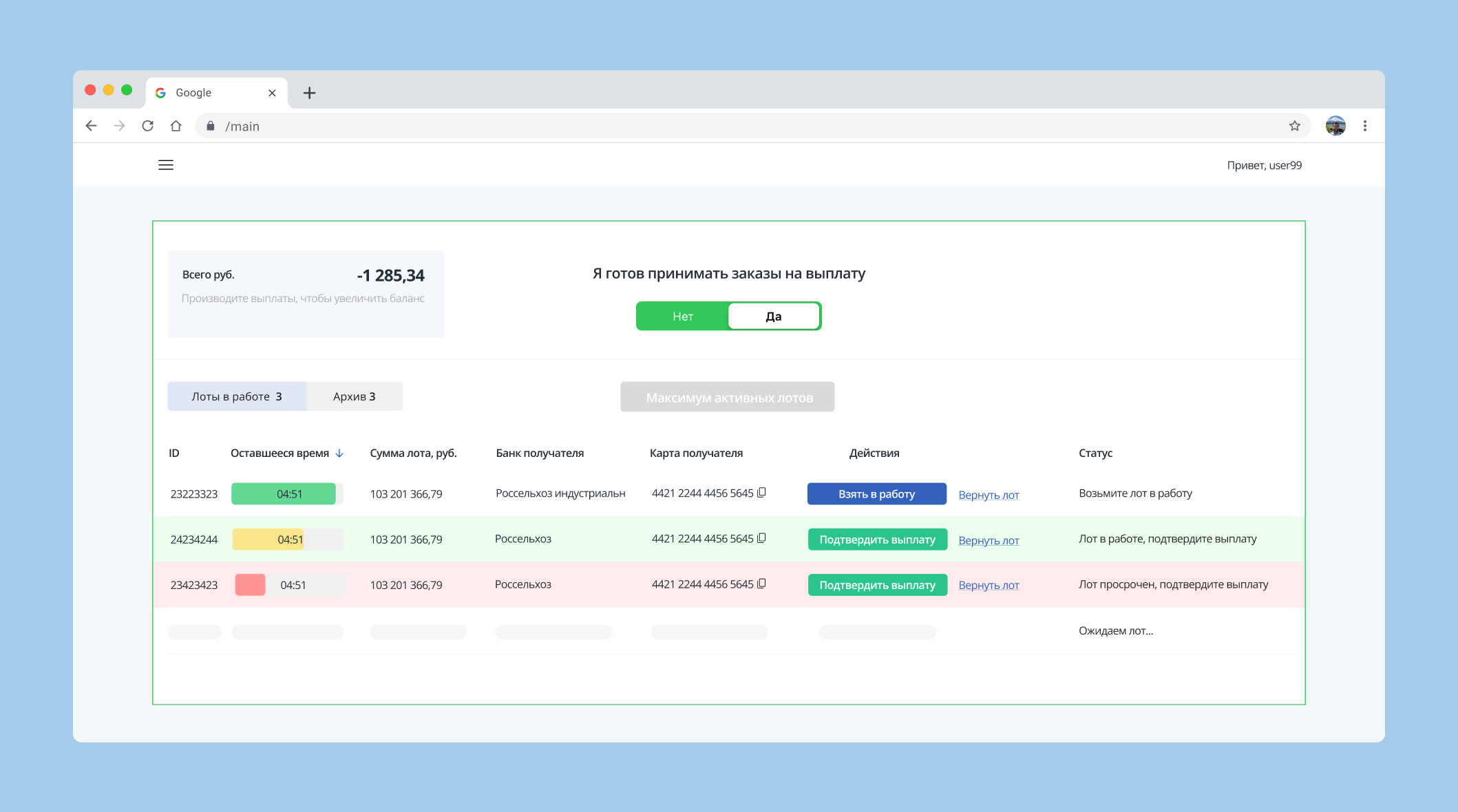 Внедрение функционала распределения лотов между пользователями и логики их обработки. Обеспечение возможности пользователям брать лоты в работу или отказываться от них. Реализация подтверждения выплат с загрузкой чека об оплате для перевода лота в статус «Исполнен».