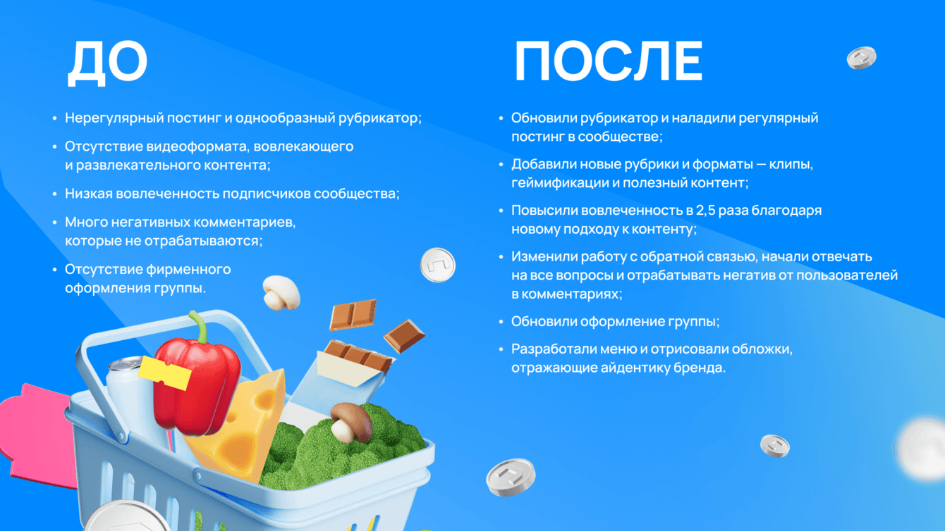 Люди приходили в сообщество за призами, не интересовались брендом и его контентом, а сразу после VK Fest начали массово отписываться. Поэтому в конце июля сервис «Пакет» пришел к нам с целью удержать набранную аудиторию, вовлечь ее в коммуникацию, познакомить с новым для России явлением – платным кешбэком в продуктовом ритейле.
