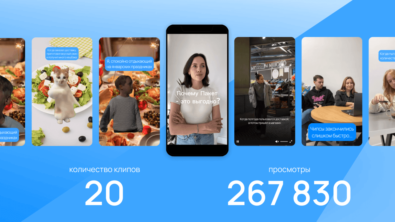 Для клипов с футажами мы обыгрываем видео-мемы, которые адаптируем под целевую аудиторию и жизненные для неё ситуации. Для видео с продакшном — разрабатываем сценарии, подбираем моделей и выезжаем в магазины X5 Group для проведения съемки. Используем тренды, сезонные инфоповоды и образы, знакомые пользователям сервиса. Часть роликов готовим в развлекательно-обучающем формате, что помогает зрителям ближе познакомиться с выгодами «Пакета».