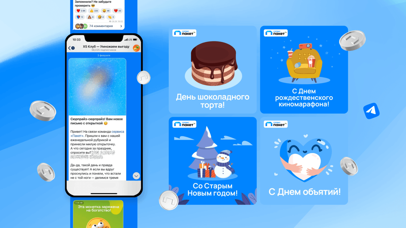 Каждые выходные мы публикуем милые и забавные открытки. Для визуала используем фирменные иллюстрации, которые скрываем под спойлер, чтобы создать интригу и привлечь дополнительное внимание пользователей. В тексте — поздравляем читателей с оригинальными праздниками и предлагаем идеи, как интересно провести выходные. В конце публикации мы дарим пользователям «Х5 Клуба» промокод. Так они могут перейти по ссылке и попробовать сервис всего за 1 рубль.