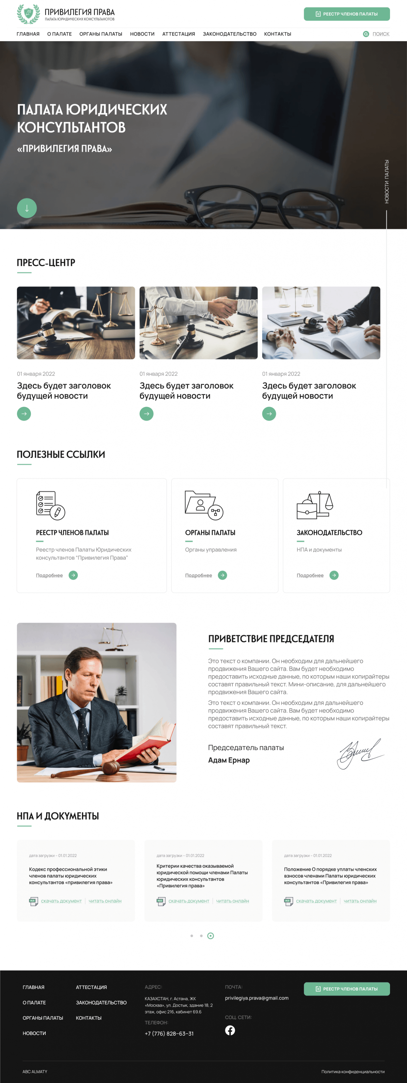 Мы рады представить результат нашей работы для Палаты юридических консультантов. Процесс разработки веб-платформы был увлекательным и продуктивным. Мы уделяли особое внимание каждой детали, чтобы обеспечить высокий уровень функциональности и удобства использования для пользователей. Надеемся, что созданный нами сайт станет ценным инструментом для палаты в предоставлении качественных юридических услуг и улучшит их взаимодействие с клиентами.