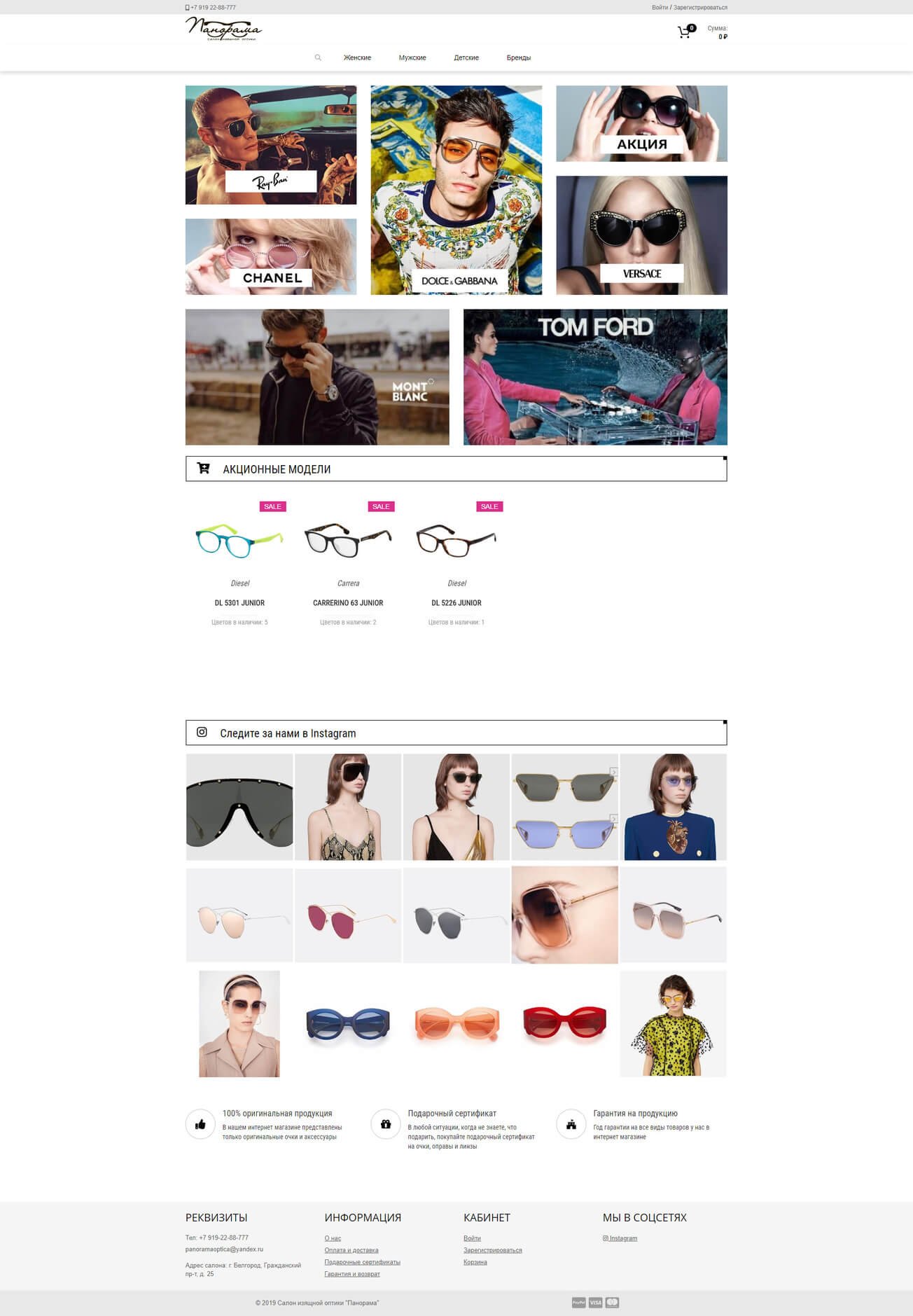 Салон изящной оптики «Панорама» специализируется на продаже брендовых солнцезащитных очков, очков для зрения и лыжных масок. Основная задача — представление компании в интернете.