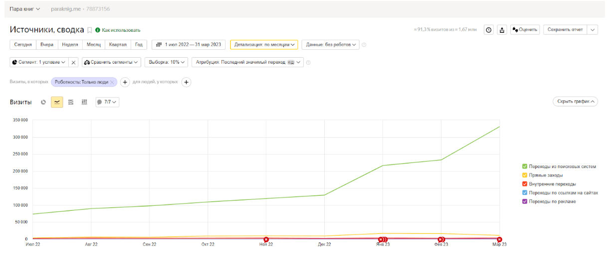 К марту 2023 видимость сайта в поисковых сетях кратно увеличилась, выросли позиции в выдаче. Сайт вышел в топ-10 по 67 % продвигаемой семантики и уверенно закрепился в выдаче. Работа с семантикой и структурой, а также техническая оптимизация продвигаемых разделов практически удвоила долю трафика из органики.