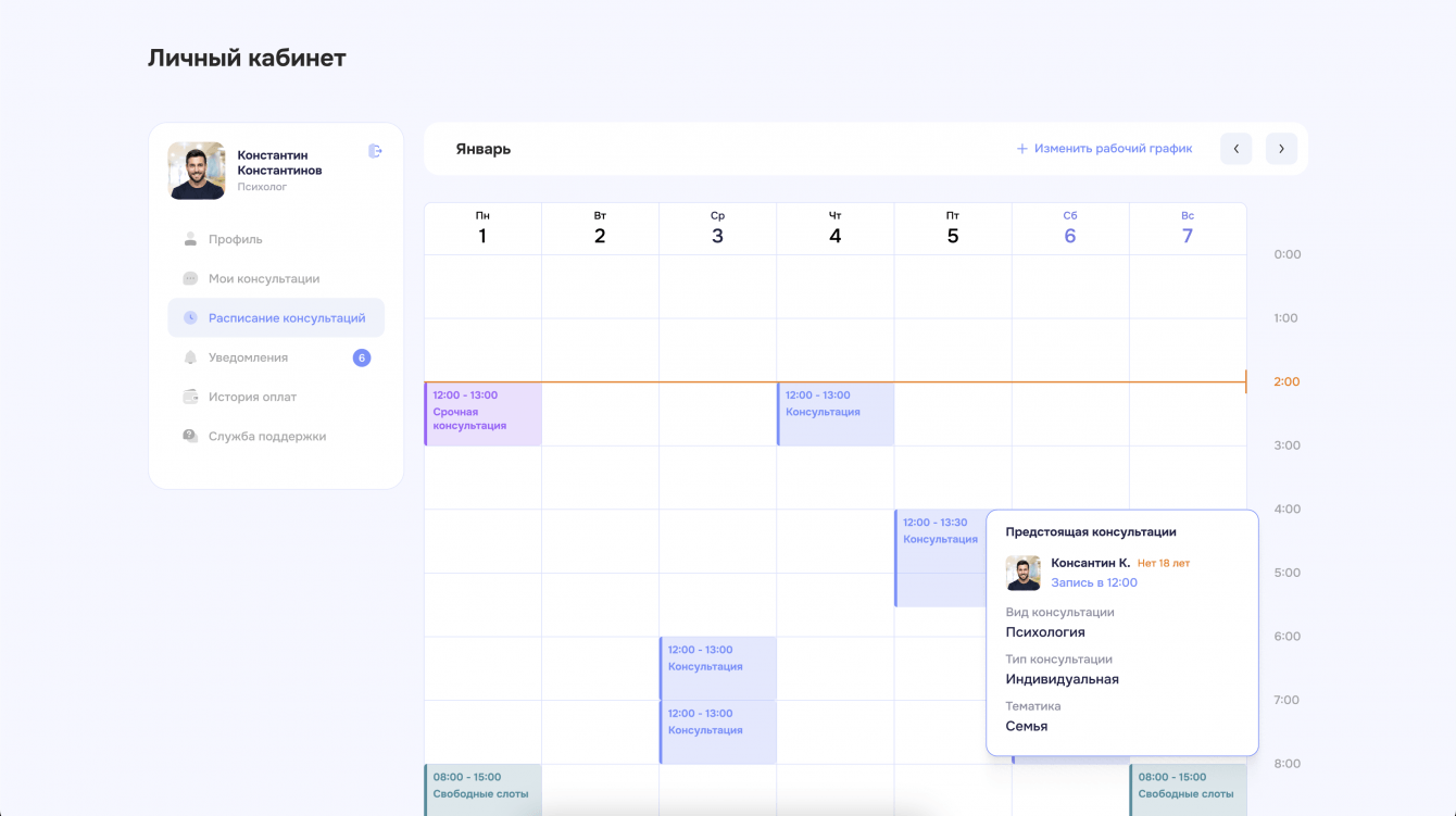 Личный кабинет имеет в своем арсенале тонну инструментария для более удобного планирования и более точечных запросов. От выбора направления и астрологического портрета до длительности консультации.