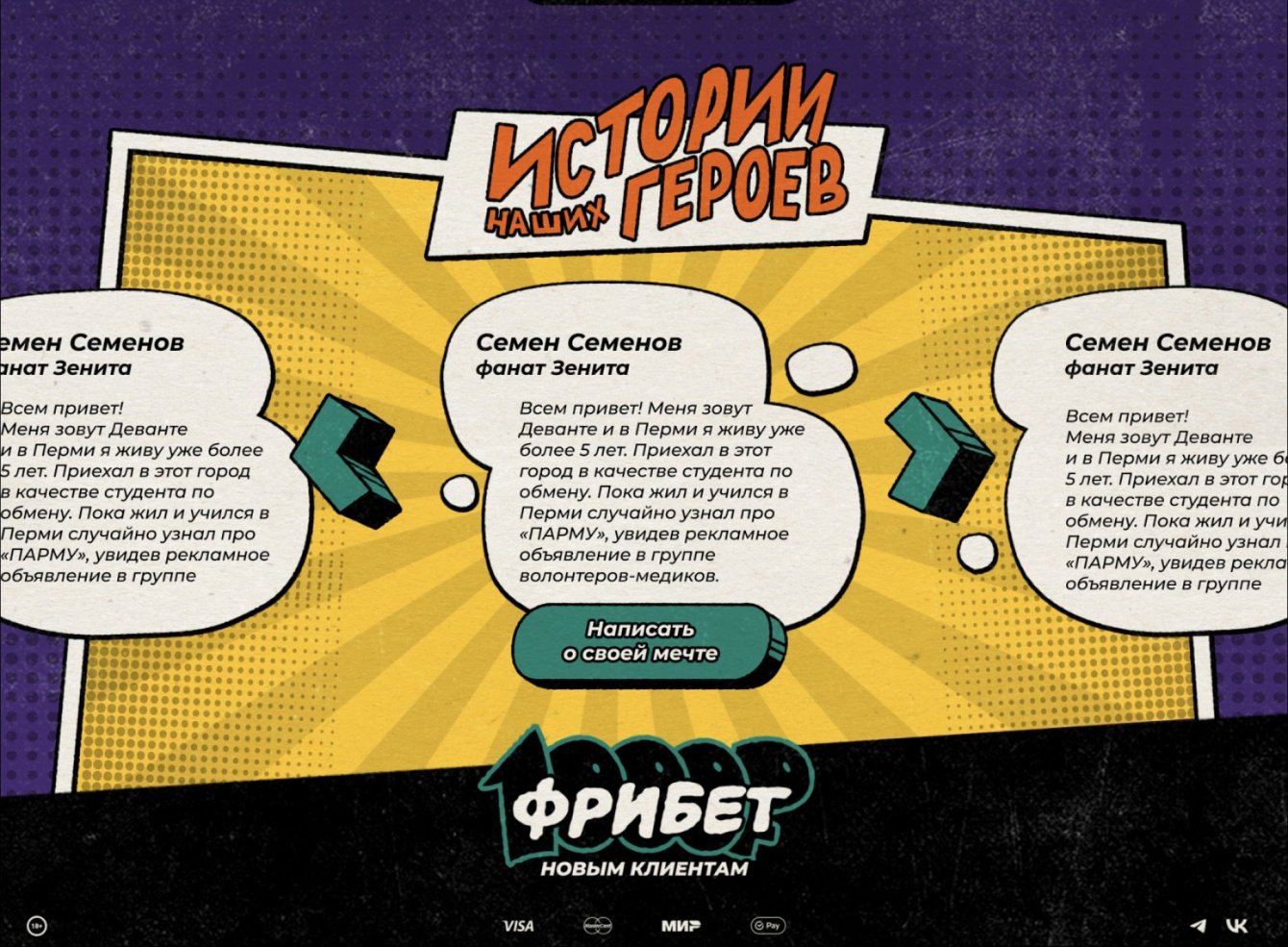 “Герой твоей команды” - имиджевый проект PARI о необычных болельщиках. Наш лендинг стал площадкой, где болельщики могут поделиться своей историей. Это создает единение в сообществе и укрепляет связь между болельщиками и командой.