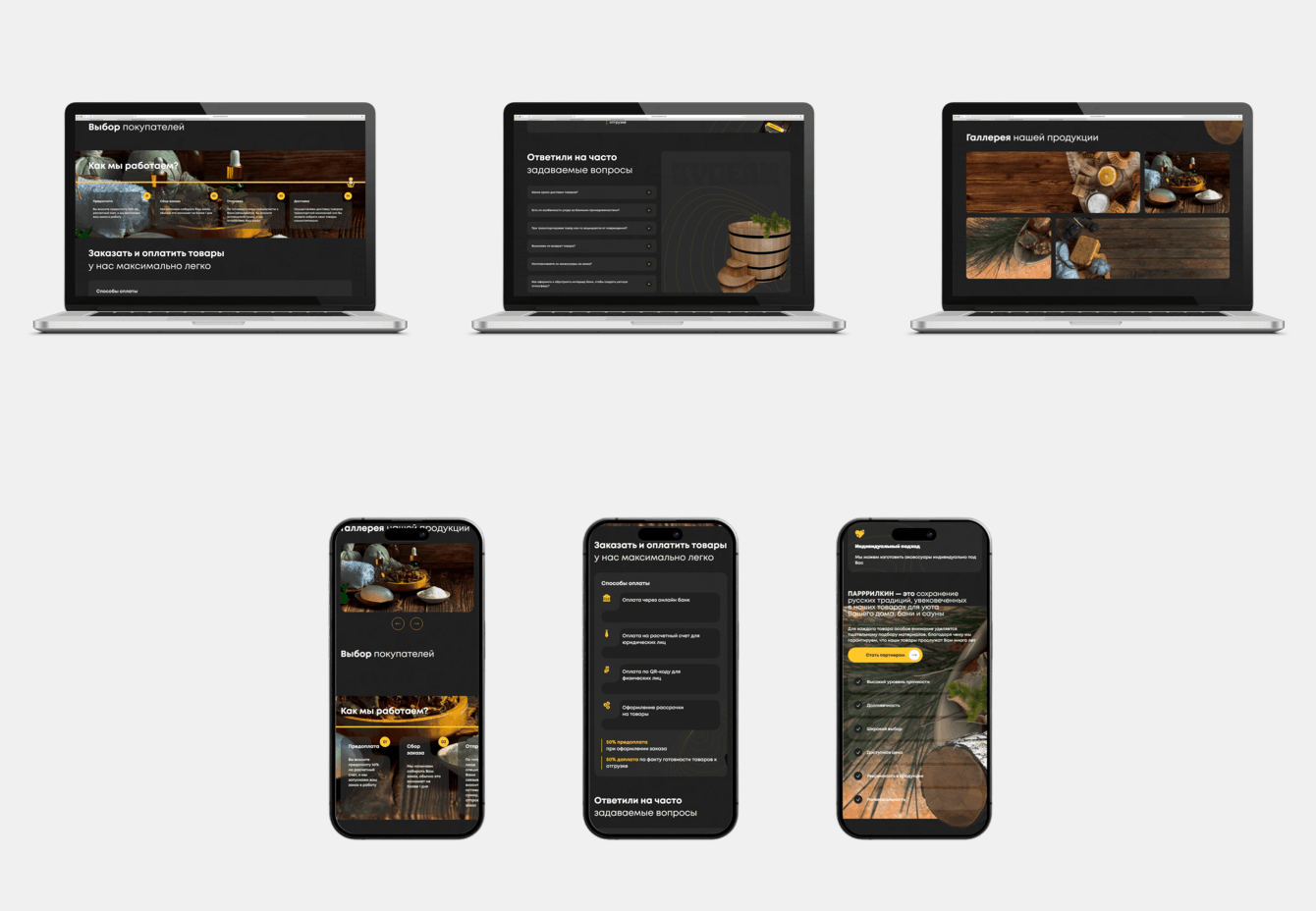 Сайт должен был стать полноценной торговой площадкой, где пользователь может не только выбрать продукцию, но и прочувствовать ценность каждого изделия, его качество и долговечность. Основная задача — создать визуально тёплый, атмосферный и понятный ресурс, который будет формировать доверие и мотивировать к покупке.
