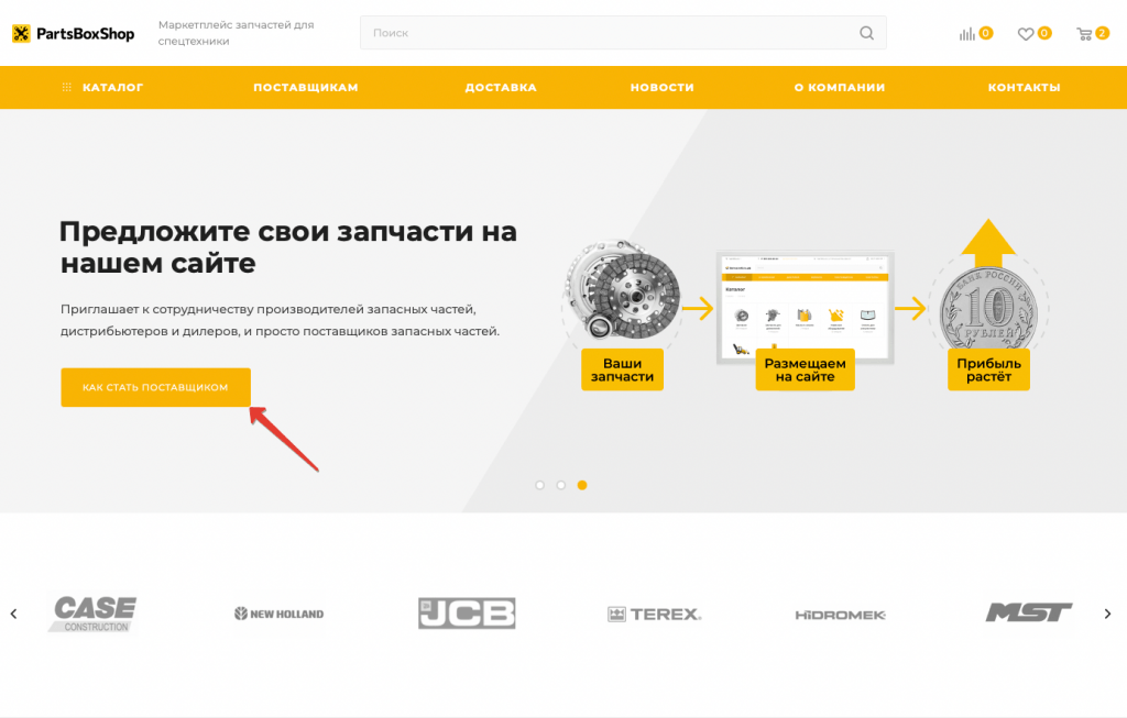 - Для поставщиков был создан отдельный раздел в котором предоставлена полная информация об условиях и преимуществах сотрудничества с компанией. Добавлена функция, которая позволяет отправить коммерческое предложение загрузив файл с номенклатурой. Это позволяет сократить время рассмотрения заявок на сотрудничество, за счет поступления информации в структурированном виде.