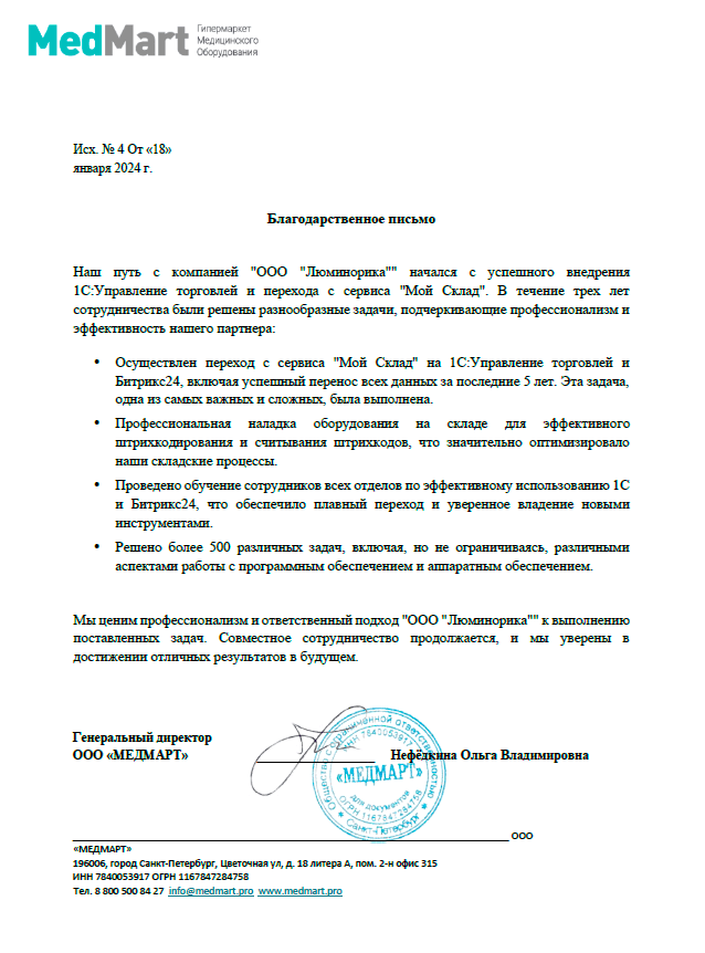 Мы ценим профессионализм и ответственный подход "ООО "Люминорика"" к выполнению поставленных задач. Совместное сотрудничество продолжается, и мы уверены в достижении отличных результатов в будущем.![]()
