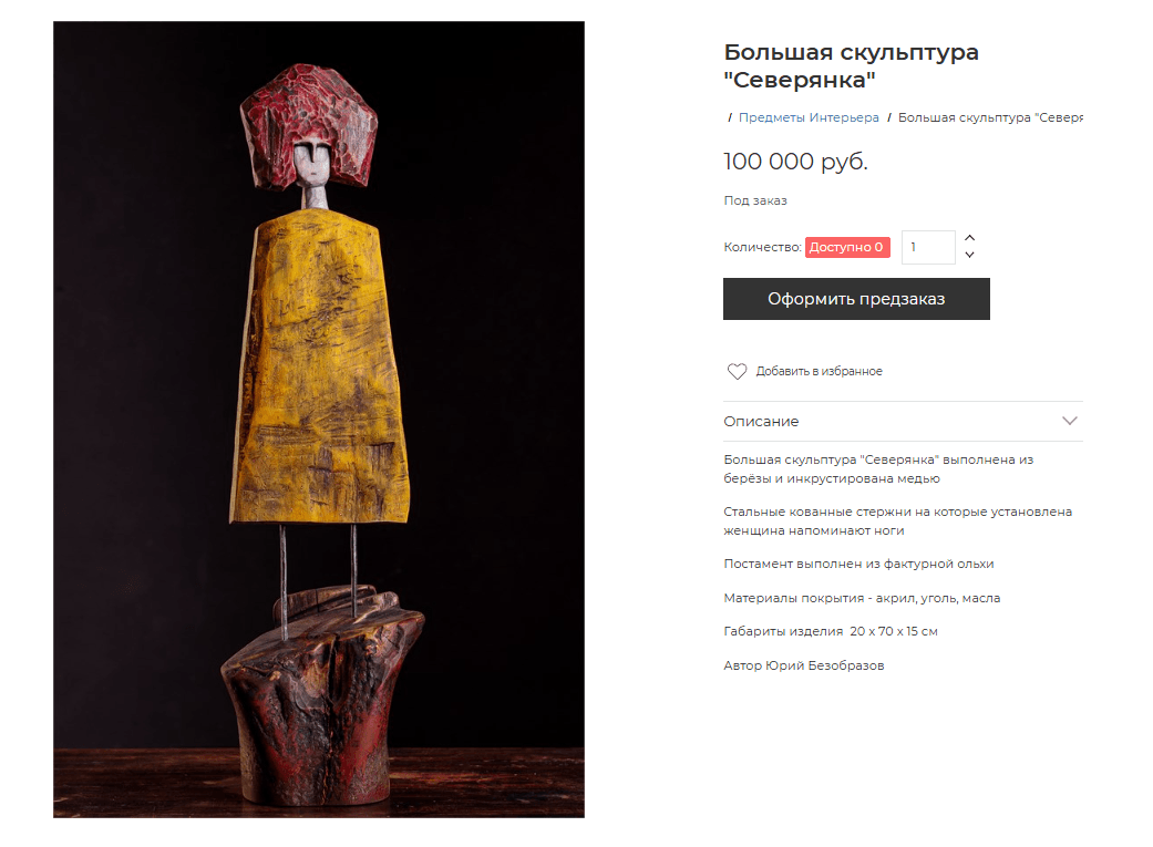 Специфика бизнеса клиента заключается в том, что все изделия — это ручная работа, а некоторые сделаны в единичном экземпляре. Чтобы зря не тратить время и ресурсы, часть продуктов делаются по предоплате. Сначала клиент оформляет заявку, а после консультации с менеджером и оплаты товара, начинают его изготовление. На сайте необходимо было реализовать возможность разместить позиции «Под заказ».