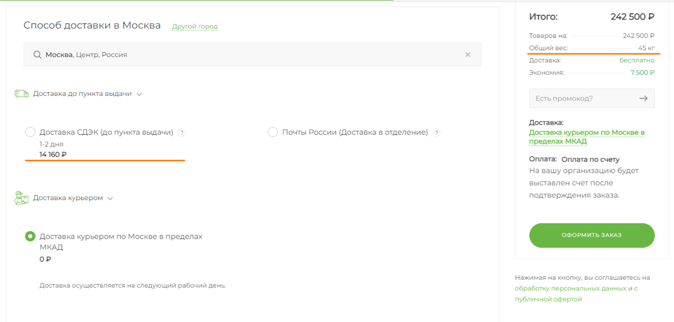 - Интегрировали модули доставки, которые автоматически подсчитывают стоимость и определяют адреса доставки по городам;