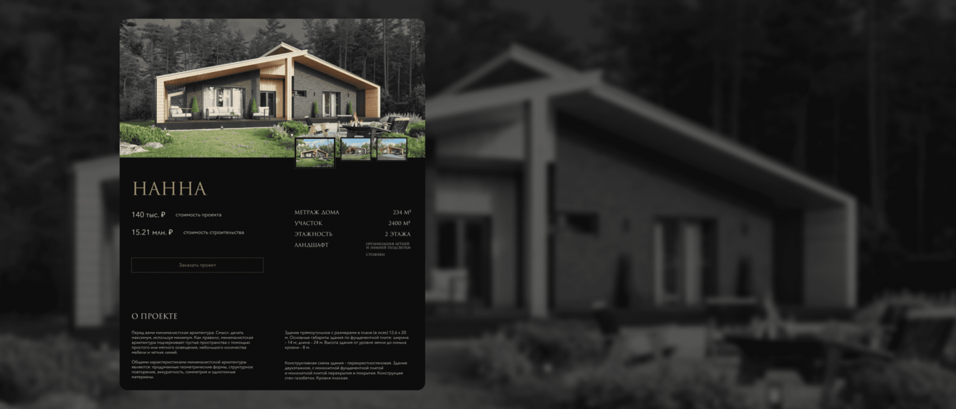 Такое решение сделало нестандартным промо-блок из одной картинки и действительно, будто подсветило дома на визуализациях. Второй важный момент был в нэйминге. Ранее все проекты заказчик называл индексами из букв и цифр, тем самым не создавая какого-то сильного образа в названии и привязки к объекту. Мы предложили давать проектам имена древних богов. В результате оформление страницы проекта, несмотря на всю строгость и лаконичность, подчёркивает всю важную информацию — сам дом, его имя, стоимость и общее описание.