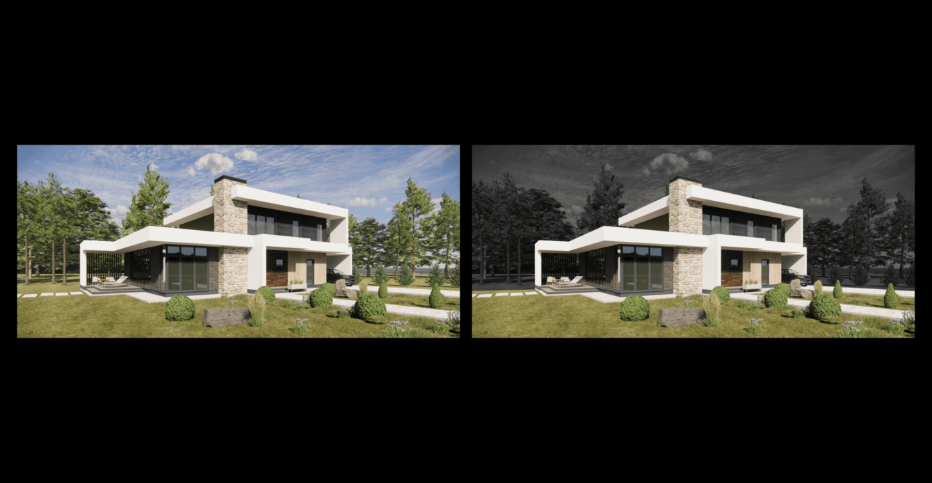 В оформлении проектов определили необходимость формирования фокуса на самом доме. Как правило всегда оформляют несколько визуализаций проектов на фоне леса или просторной территории с большой заливкой неба. Поэтому мы решили в стандартных визуализациях сделать задний фон чёрно-белым. Это позволило не просто показать яркую картинку, а обратить внимание именно на дом, а не на том, что к этому дому не относится.