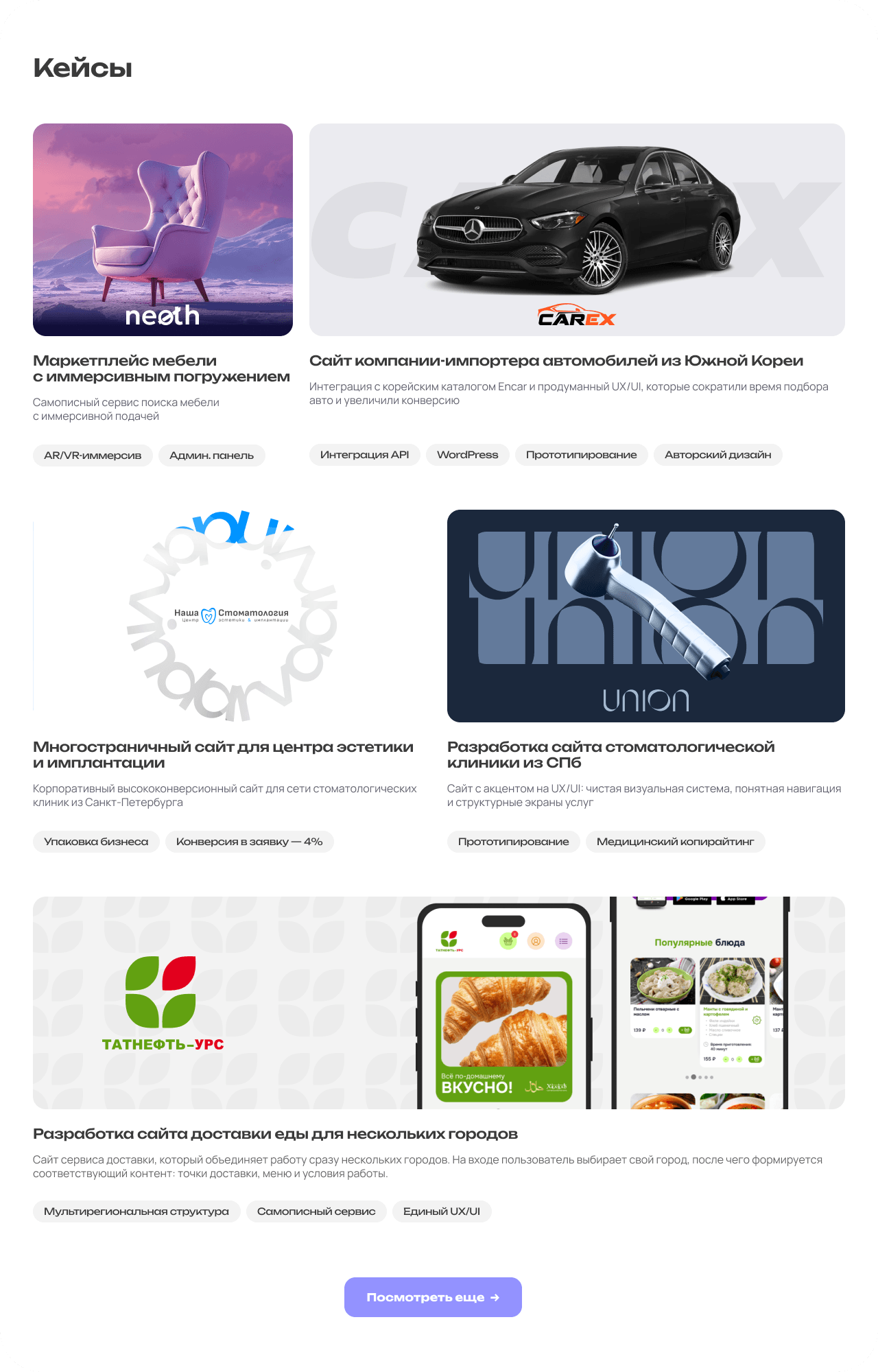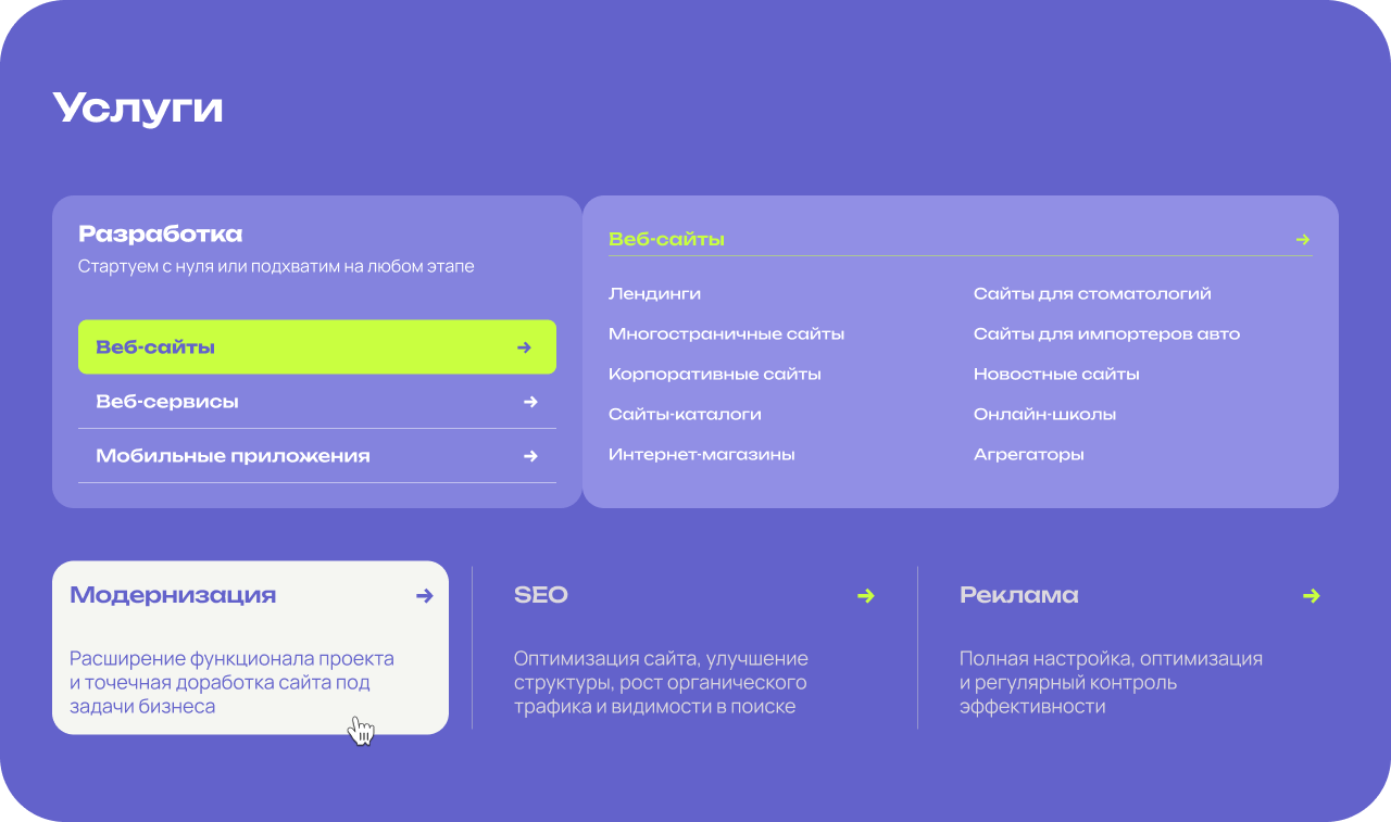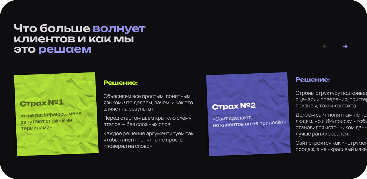 Кейсы, услуги, ответы на страхи, понятная точка входа в диалог.