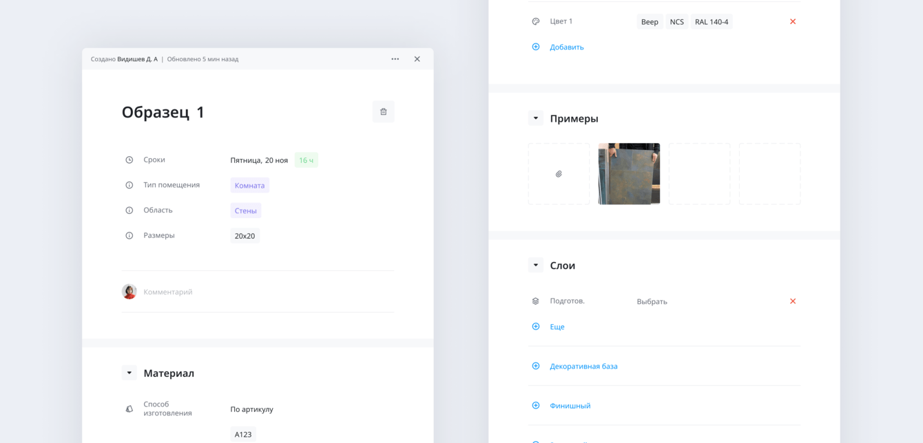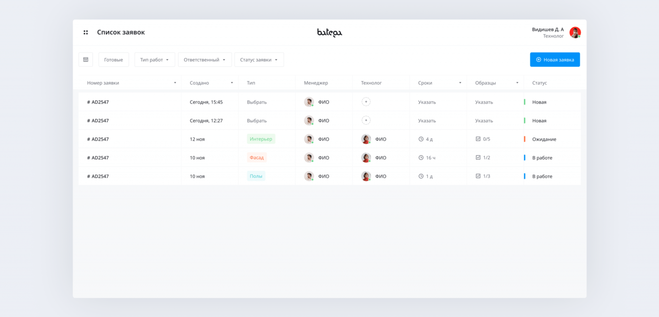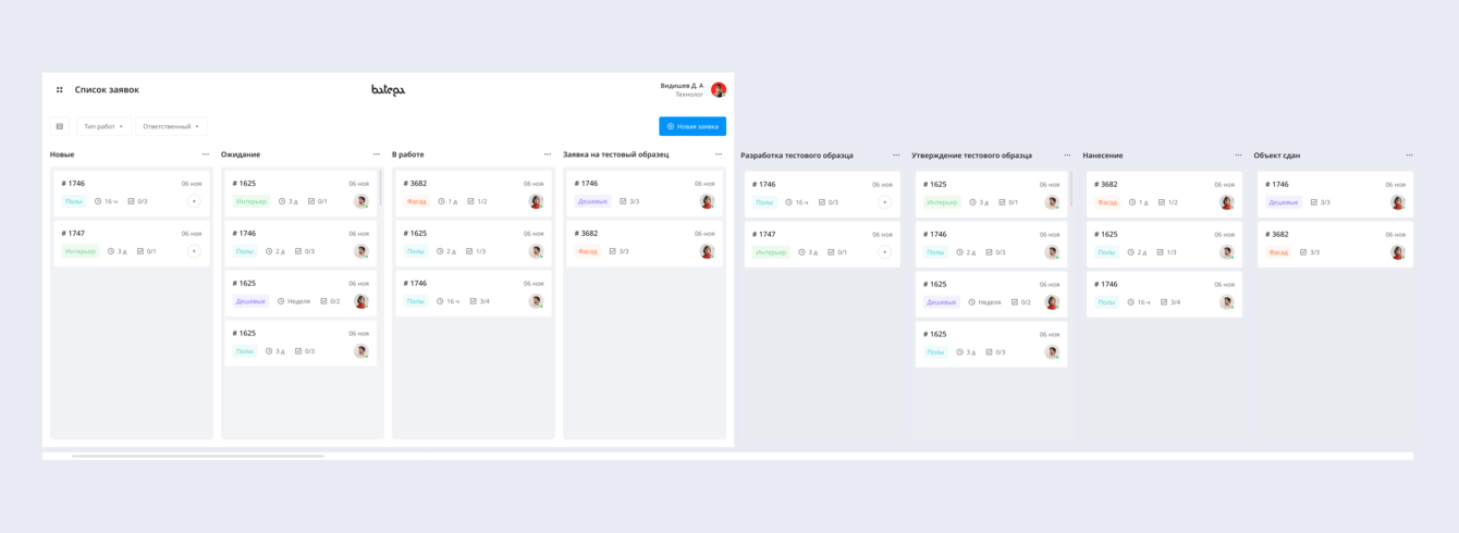 При получении лида заявка падает в нашу систему. Теперь ей предстоит сложный путь от связи с сейлзом, выпуска тестовых образцов и в конце уже нанесения на стену штукатурки. Мы разработали общую доску для руководителей и сейлзов, которые курируют весь процесс и отдельную для технологов, так как их беспокоит только производство.