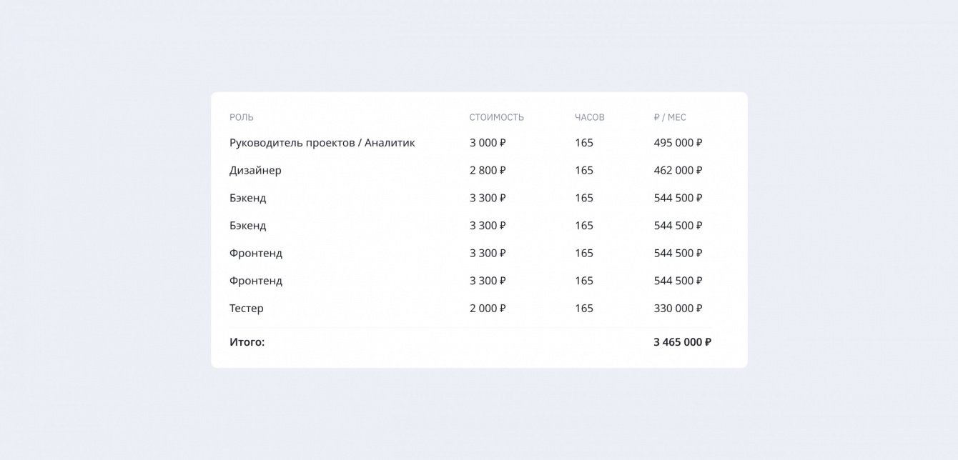 Мы не фанаты «написал в директ», поэтому хотим указать хотя бы примерную стоимость похожего продукта, которая зависит от систем интеграции и специфики вашего бизнеса. Расчет мы ведем по Time & Material. Указываем очень общую стоимость команды в месяц, но проект такой будет делаться около 3 месяцев, то есть 10 млн. руб. очень поверхностная оценка.