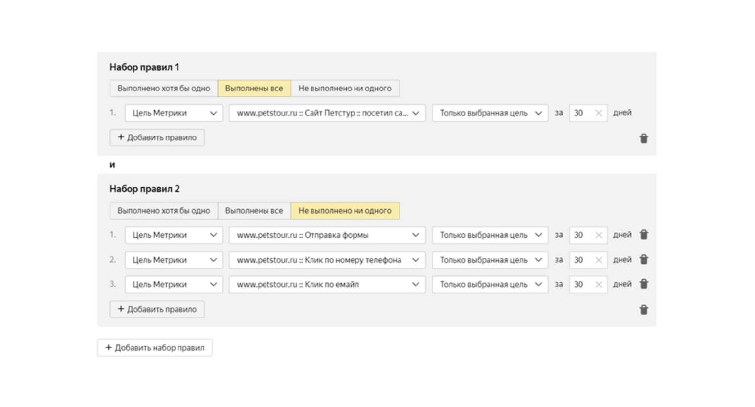 Аудитория для ретаргетинга строго отсортирована. Это пользователи, которые были на сайте в течение 30 дней, но не выполнили ни одной цели.