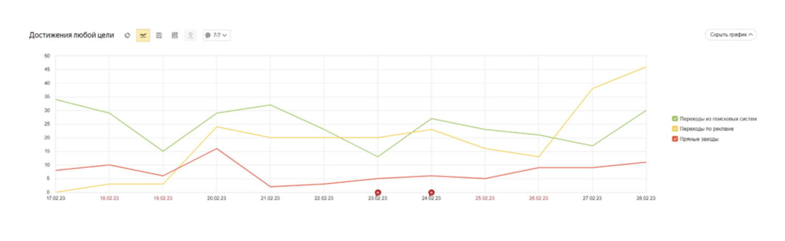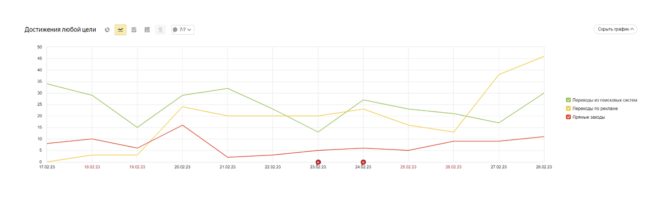 Скриншот: график конверсий в обращения с рекламы, SEO и прямых заходов.