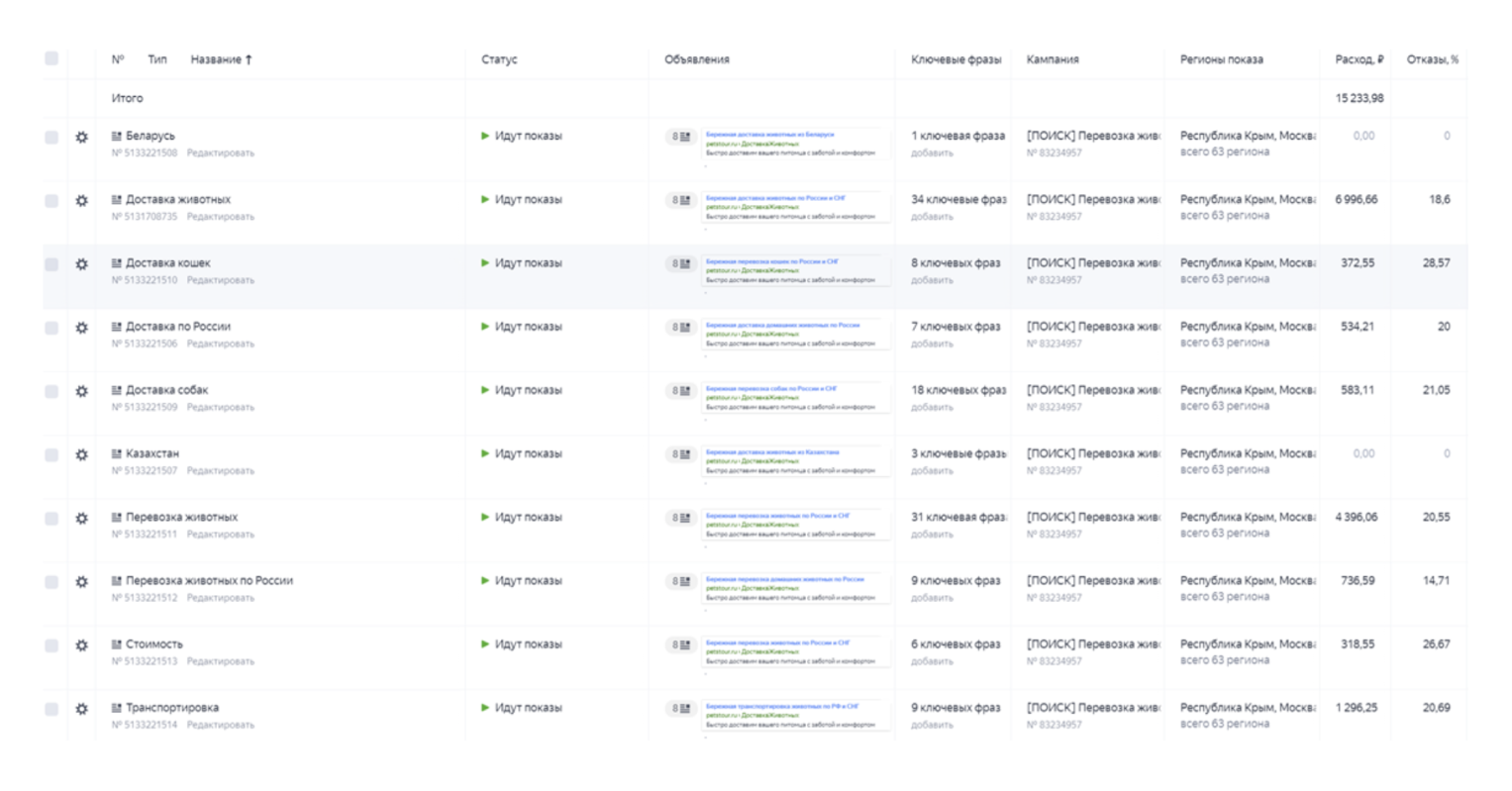 Изначально заказчик отсеял ключи с «такси». PetsTour занимается доставкой между городами, а такси — это перевозки в черте города. Но мы решились на риск и убедили клиента. Так появилась отдельная кампания для проверки гипотезы.