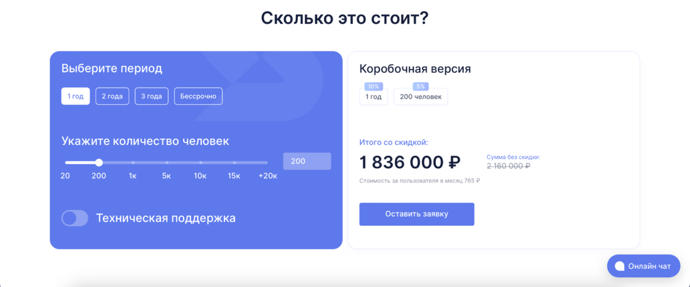 Но самое интересное на этой странице с точки зрения разработки — калькулятор стоимости. В нем пользователь может выбрать период и число сотрудников, отметить нужна ли ему будет техническая поддержка, после чего ему будет сразу доступна итоговая стоимость и возможность оставить заявку.