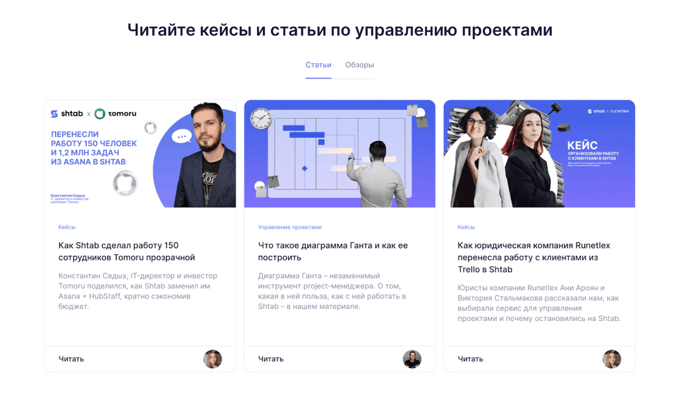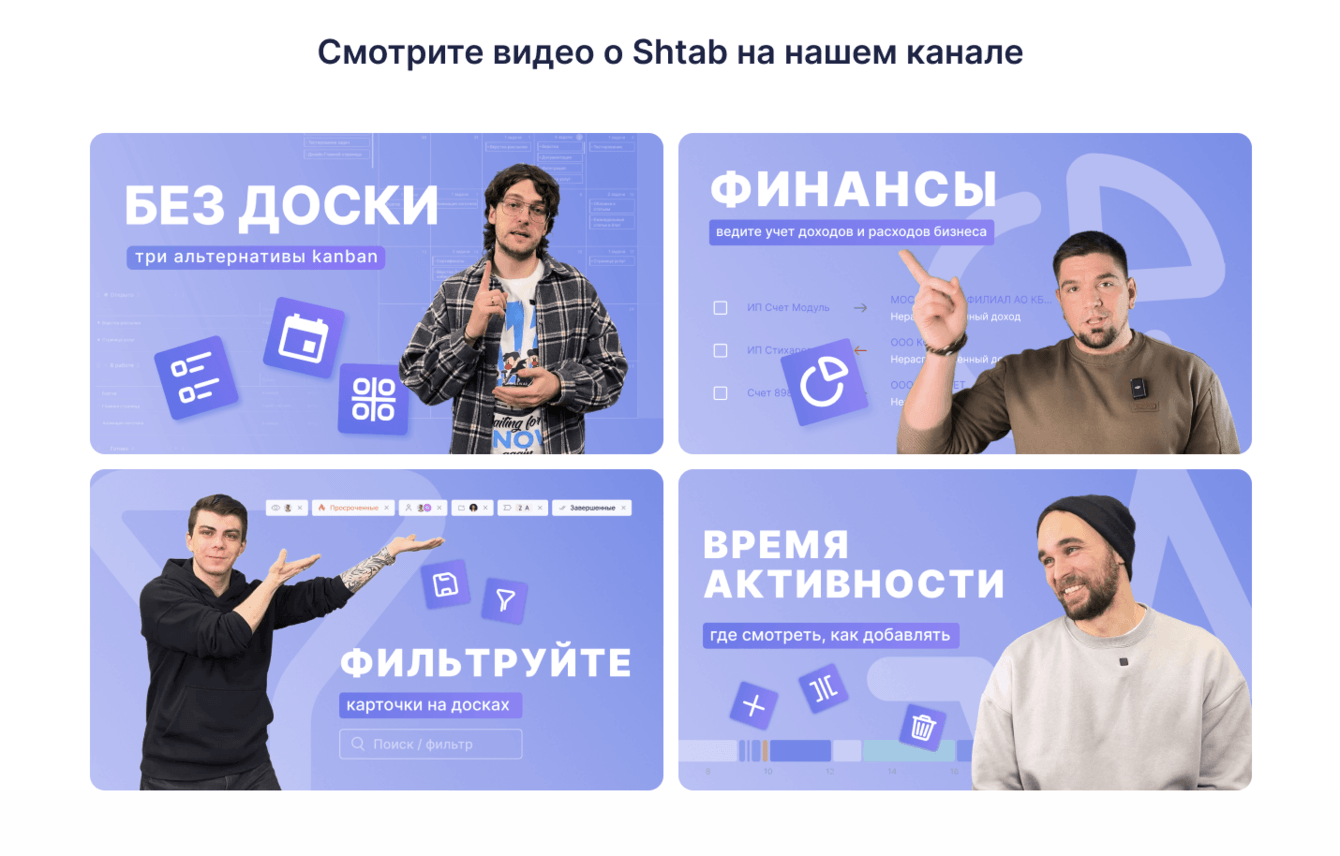 Помимо этого, добавили новые блоки с YouTube-видео (а затем и RuTube), на которых специалисты Shtab рассказывают о возможностях сервиса и делятся полезными лайфхаками по работе.