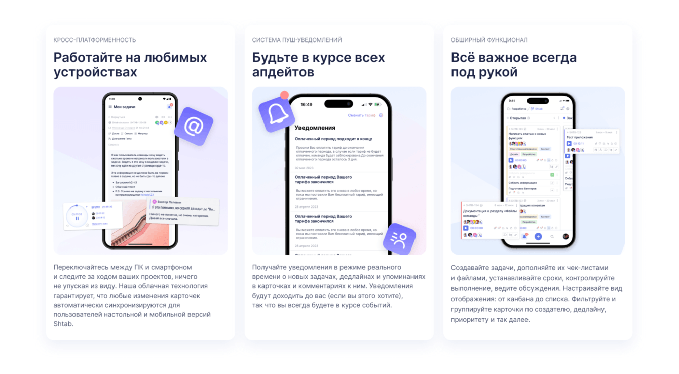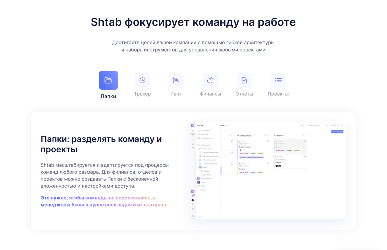 В будущем планируем переработать структурно страницу со всеми возможностями сервиса, а также разработать страницы о команде, сравнениях с аналогичным ПО и сценариях использования Shtab разными направлениями бизнеса.