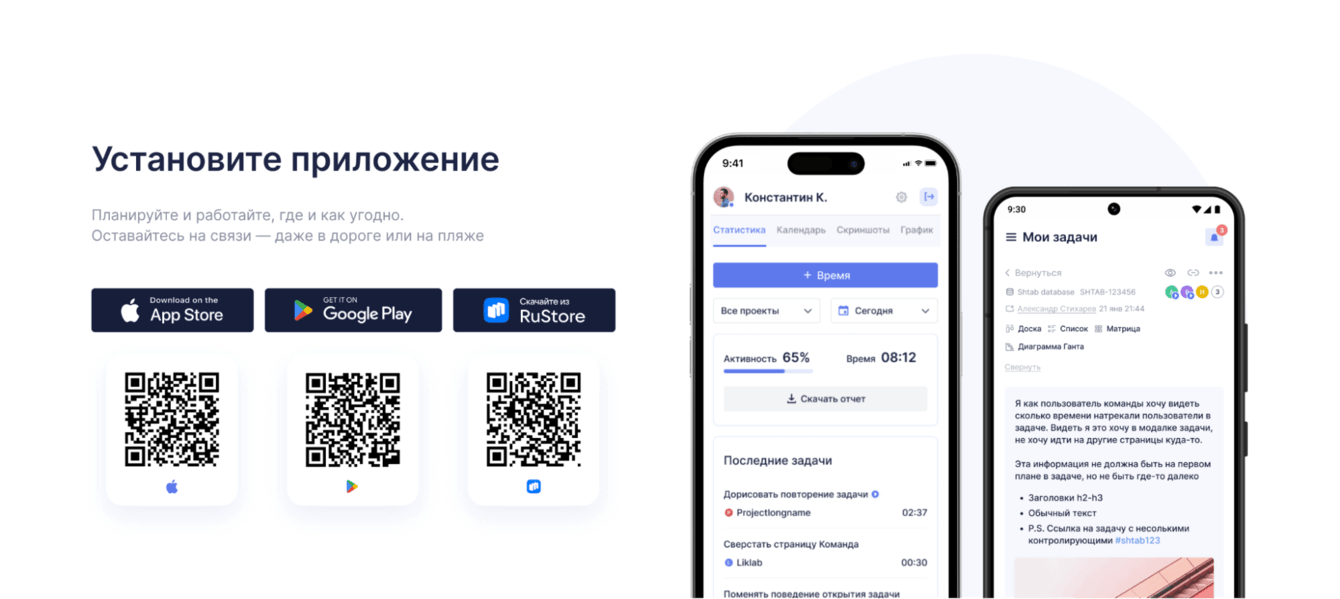 Ко времени апдейта сайта у Shtab вышло нативное приложение на Android, поэтому в блоке с загрузкой мы добавили кнопки Google Play и RuStore.