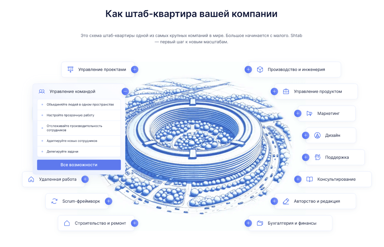 Чтобы подчеркнуть эту ассоциацию, мы разработали схематичное изображение крупной штаб-квартиры, вокруг которой разместили небольшие блоки с подсказками о том, как сервис помогает каждому из направлений. А также добавили возможность перейти в раздел со всеми возможностями Shtab.