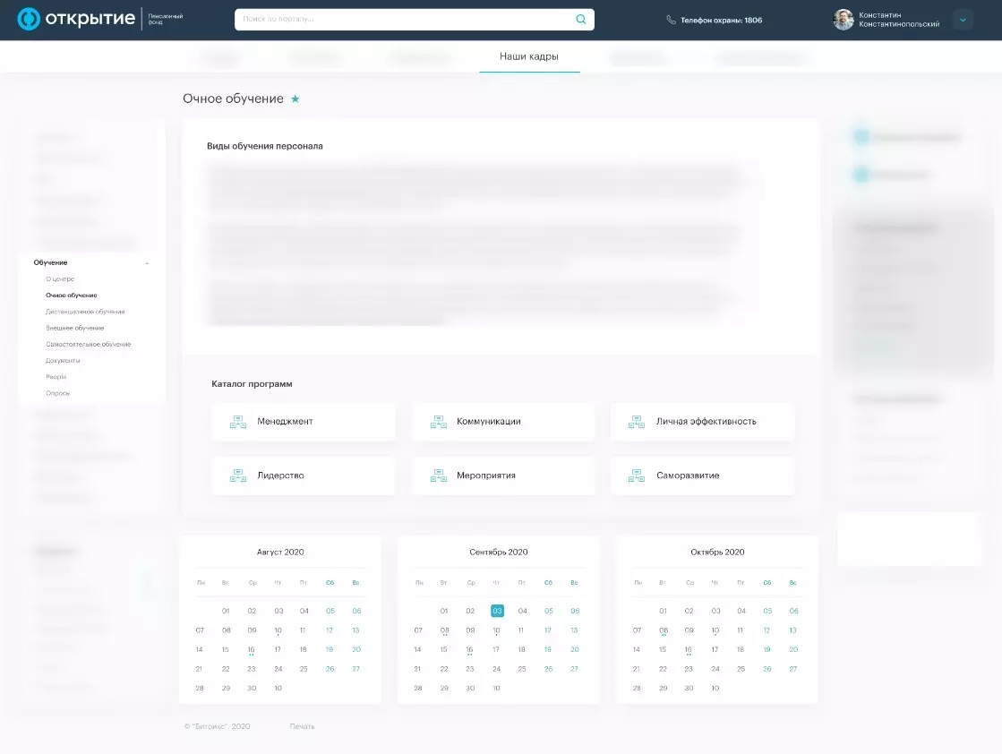 Мы разработали раздел «Обучение» с опциями очного и дистанционного прохождения курсов. В очные курсы входят онлайн-лекции и возможность записи на очные мероприятия. Дистанционное обучение — это заранее записанные видео, текстовые лекции и практические задания, а также тестирование в конце обучающего курса.