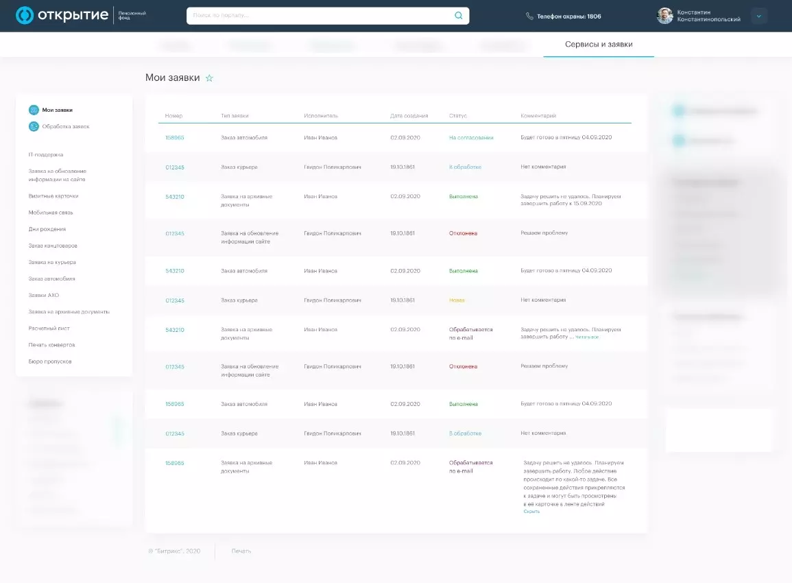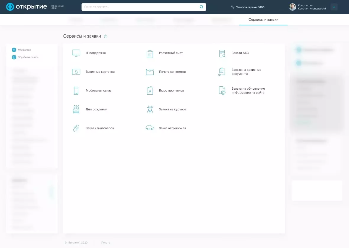 Мы составили категории потребностей сотрудников: заказ визиток, транспорта, вызов курьера. Разработали раздел, в котором для каждой потребности есть своя форма заявки. После заполнения формы задача автоматически отправляется ответственному сотруднику, а ее статус отображается в интерфейсе.